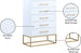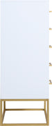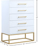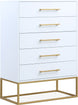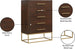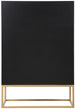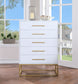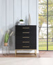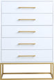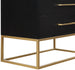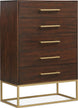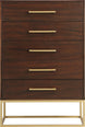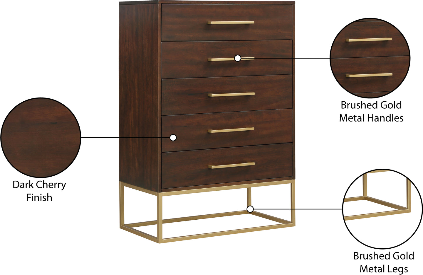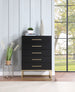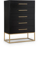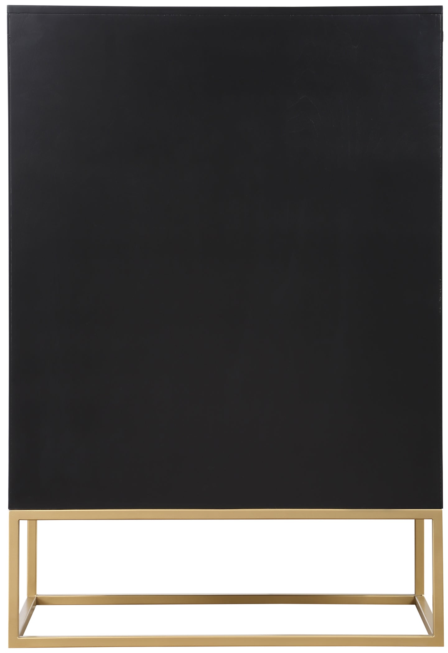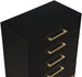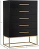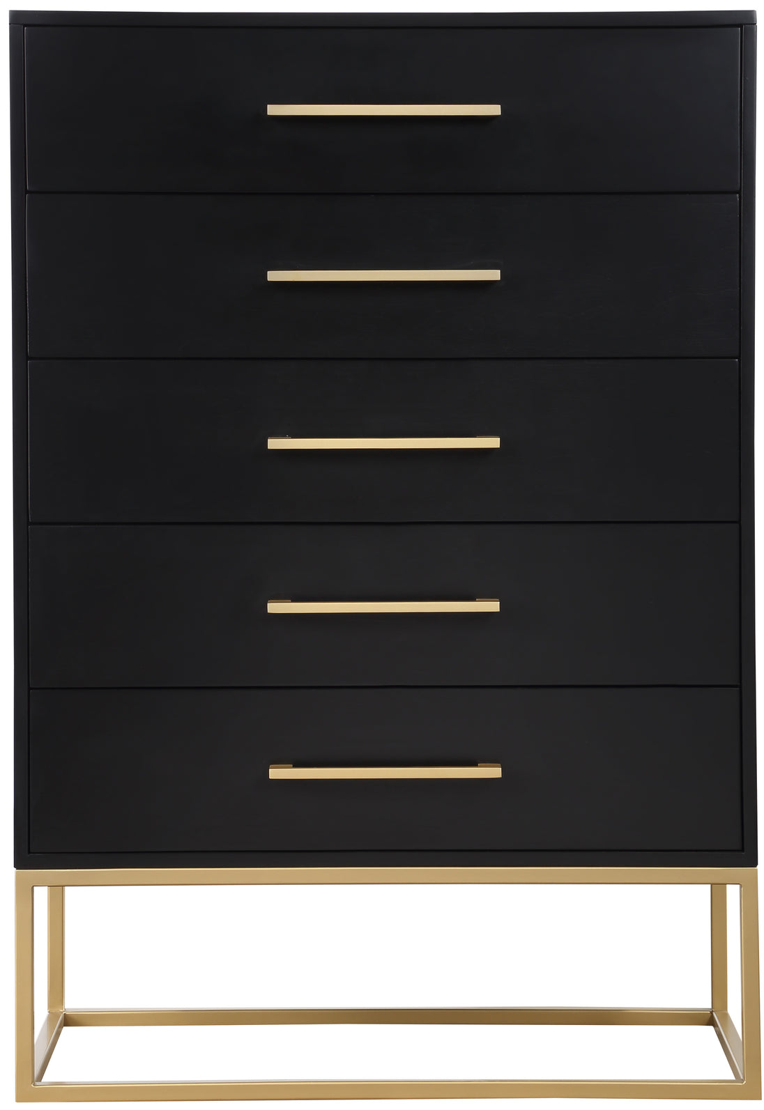 Inject bold, modern styling into your bedroom with this Maxine chest. The chest's contemporary design is nothing short of stunning, with unassuming lines and eye-grabbing hardware. A rich black finish is modish and up-to-the-minute, while the brushed gold metal legs and drawer handles give this unit added flair. A metal base raises the chest from the floor for a noticeably upscale vibe. Fill this chest's drawers with essentials for keeping your bedroom space clean and neat.
