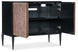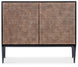 A sleek silhouette gets a craftsman-like finish with the Boucle Accent Chest. A clean design with tapered legs crafted of Maple Veneer with a black exterior, the chest has a contrasting warm brown interior and carved door fronts in a basketweave motif. The two latch doors with soft-close hinges have one adjustable wood shelf behind and a ventilated back panel with wire management.