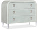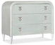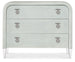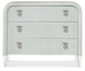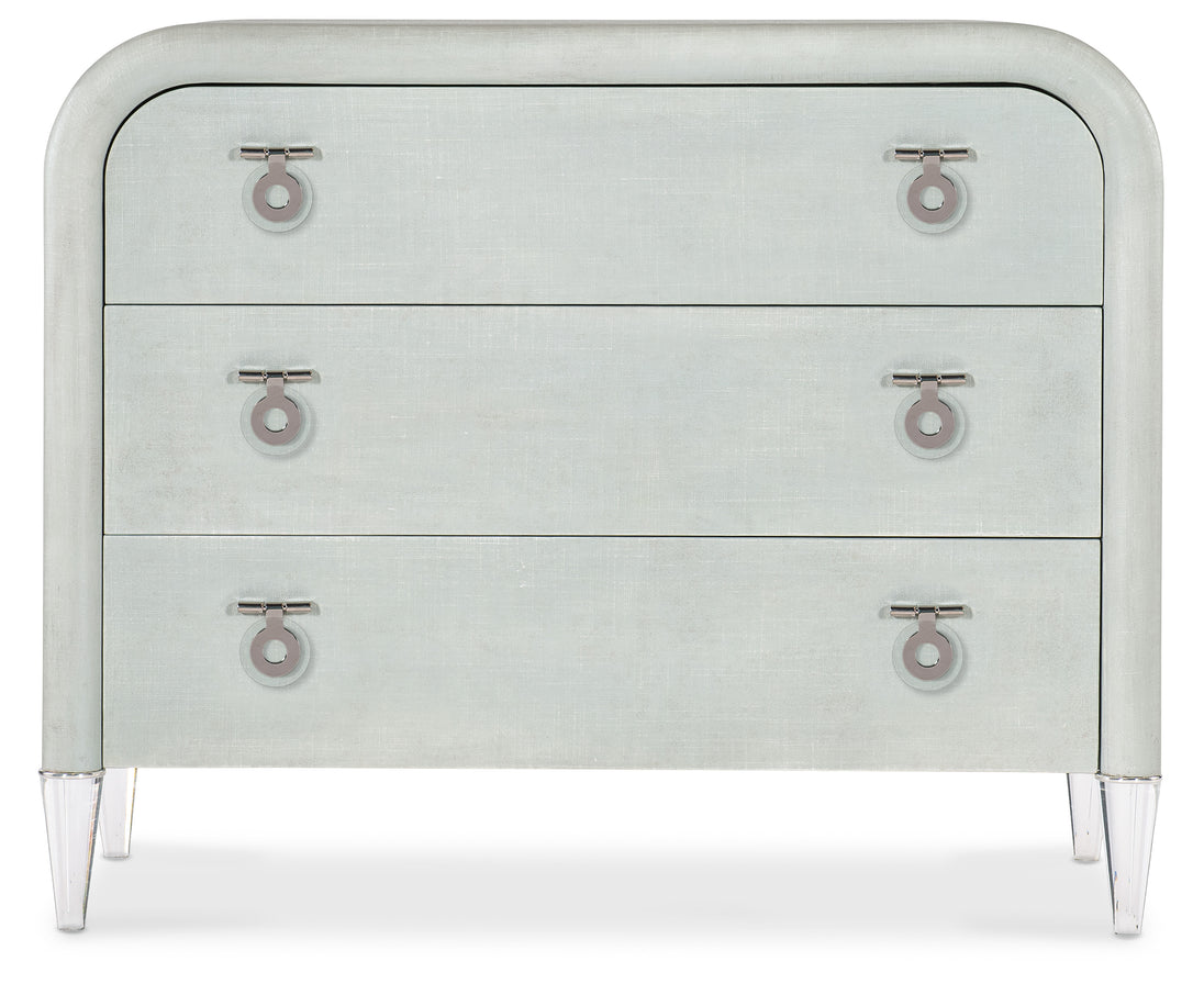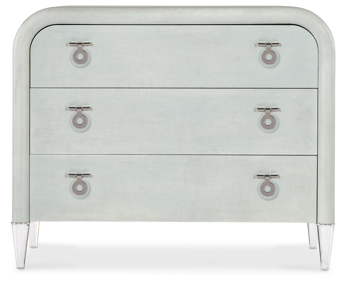 With an understated modern elegance, the Julip Accent Chest is designed with a clean silhouette, clear acrylic legs and silver chrome-colored metal accents. With a light seafoam green-colored linen-wrapped exterior and drawer fronts and rounded corners, it has chrome-hued, jewelry-like metal drop pulls and three self-closing drawers.
