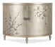 In a delicate French design with a tactile form, the Marguerite Demilune Chest is crafted of wood with champagne leaf linen with handpainting. There’s one fixed shelf behind the doors and a vertical divider that creates four open spaces on the inside. Silver-finished custom floral knobs add a stylish accent.