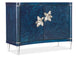 The glamour is in the details of the Mélange Sapphire Chest: the rich sapphire-blue finish over figured Primavera Veneers, the broach-like dramatic silver floral hardware, silver metal accents and acrylic legs. It all adds up to an uptown accent to create a burst of style for any space. The two doors have soft-close hinges and magnetic door catches with one adjustable shelf inside and one soft-closing drawer inside. The drawers have a painted blue interior.