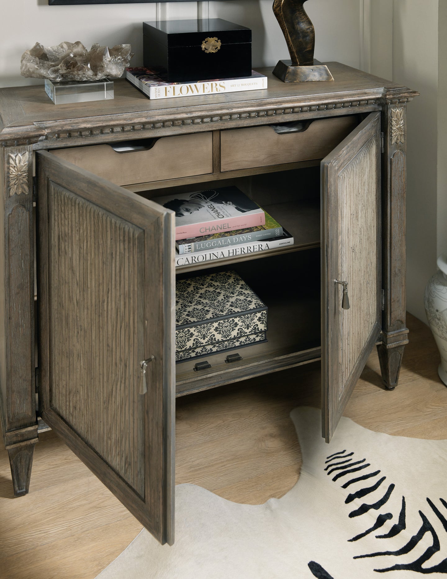 The epitome of understated elegance, the Madame Accent Chest channels rustic luxury with a Quartz Grey finish in a light wood tone with areas of cool gray burnishing, creating a subtle two-tone effect. The decorative pulls are in pewter-colored metal. Two doors and two drawers behind the doors, and one adjustable shelf behind the doors. Crafted of Poplar and Hardwood Solids with Oak Veneers. Ventilated Back Panel.