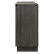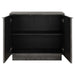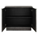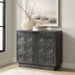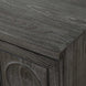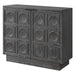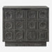 A two door cabinet featuring a striking carved circular design, constructed from solid elm and elm veneer. The rich ebony stain highlights the dramatic wood grain. Two complementing solid iron door pulls make for stylish and effortless functionality. Has one interior adjustable shelf.