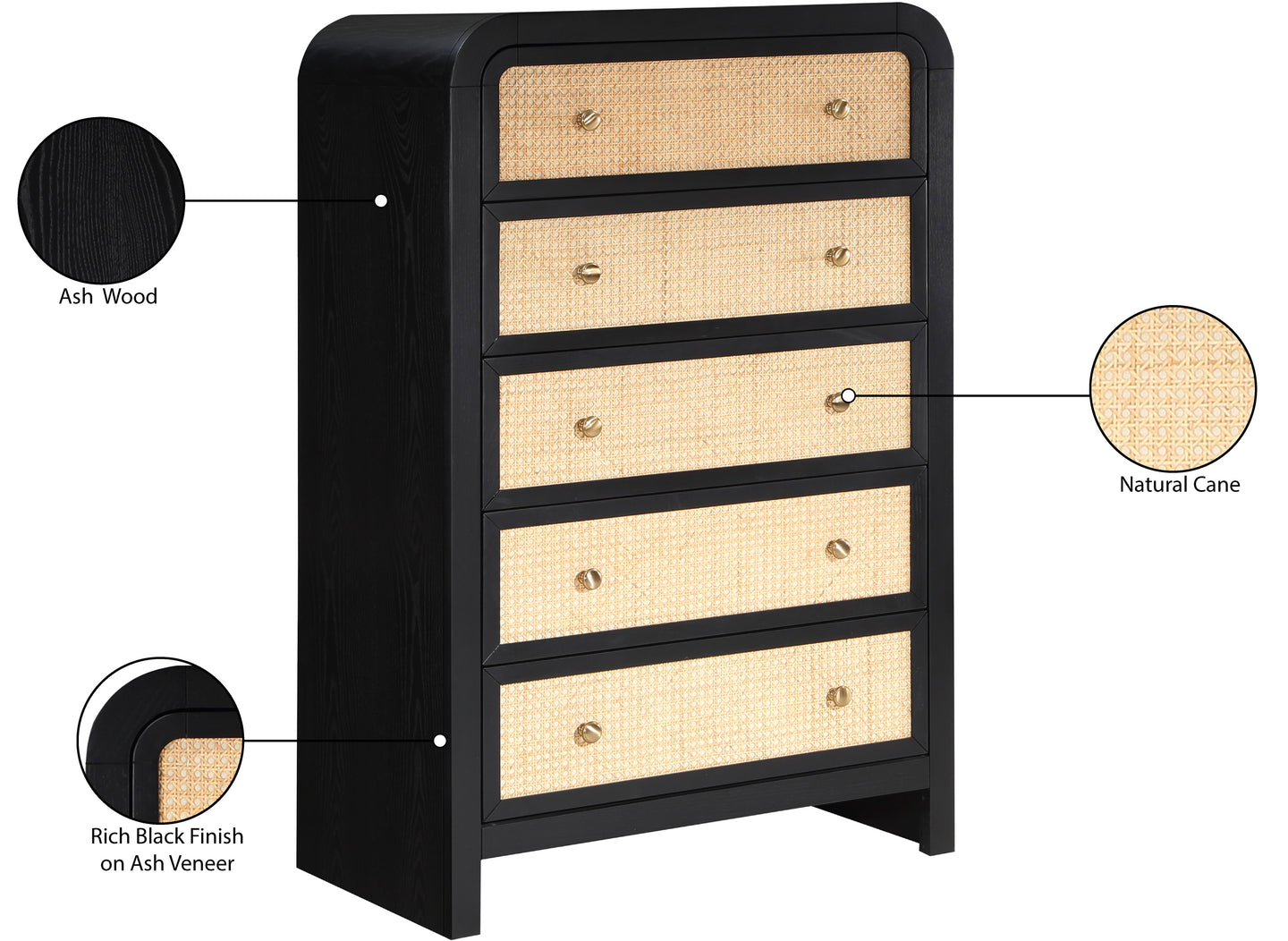 Introduce a touch of elegance and comfort to your bedroom by incorporating the Siena Chest into your decor. The natural cane drawers and stunning black ash veneer finish create a striking contrast that exudes charm and sophistication. The chest is constructed from Ash wood, ensuring both durability and longevity. Its sleek and modern design makes it an ideal addition to any contemporary bedroom aesthetic. Experience the perfect blend of functionality and style with the Siena Black Chest.