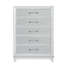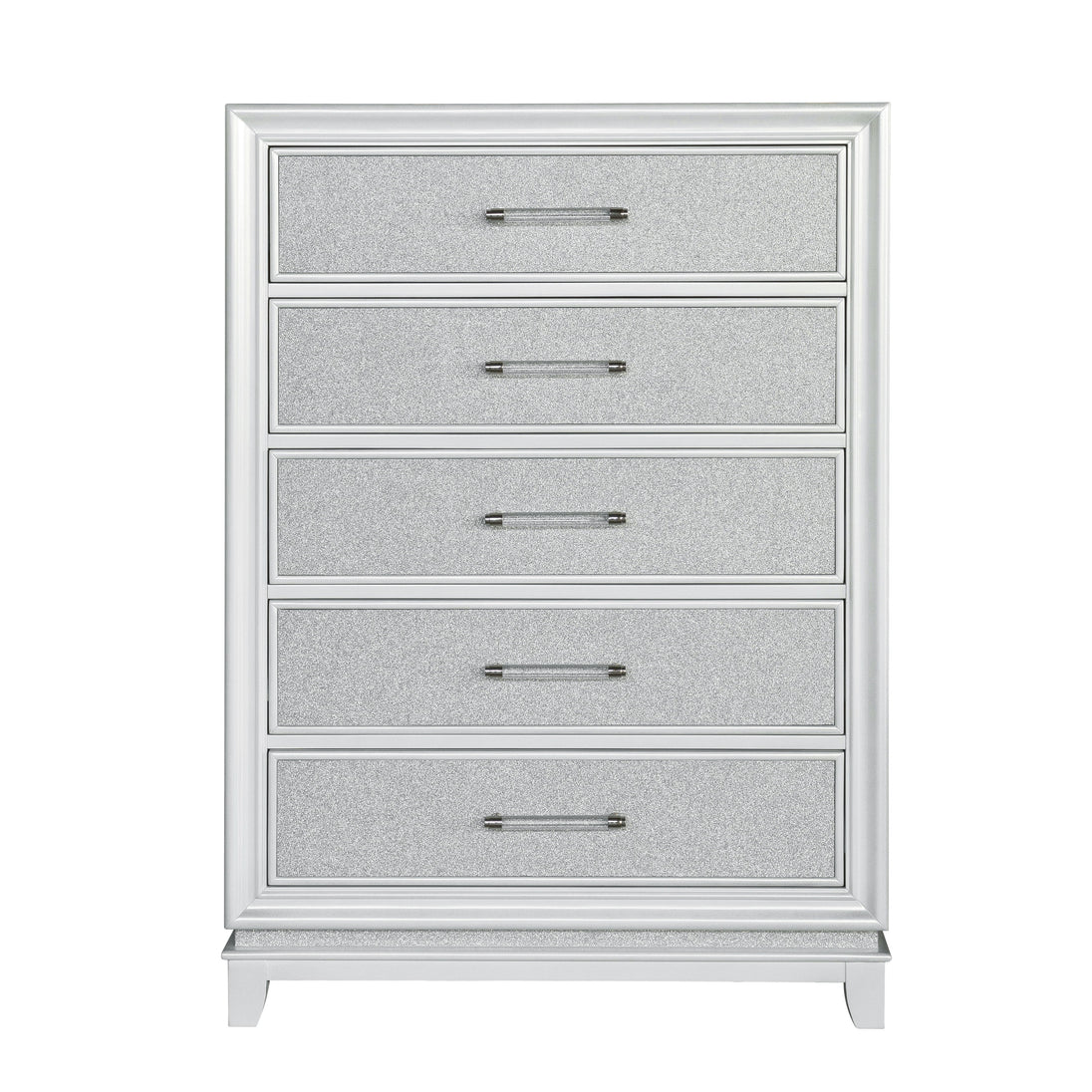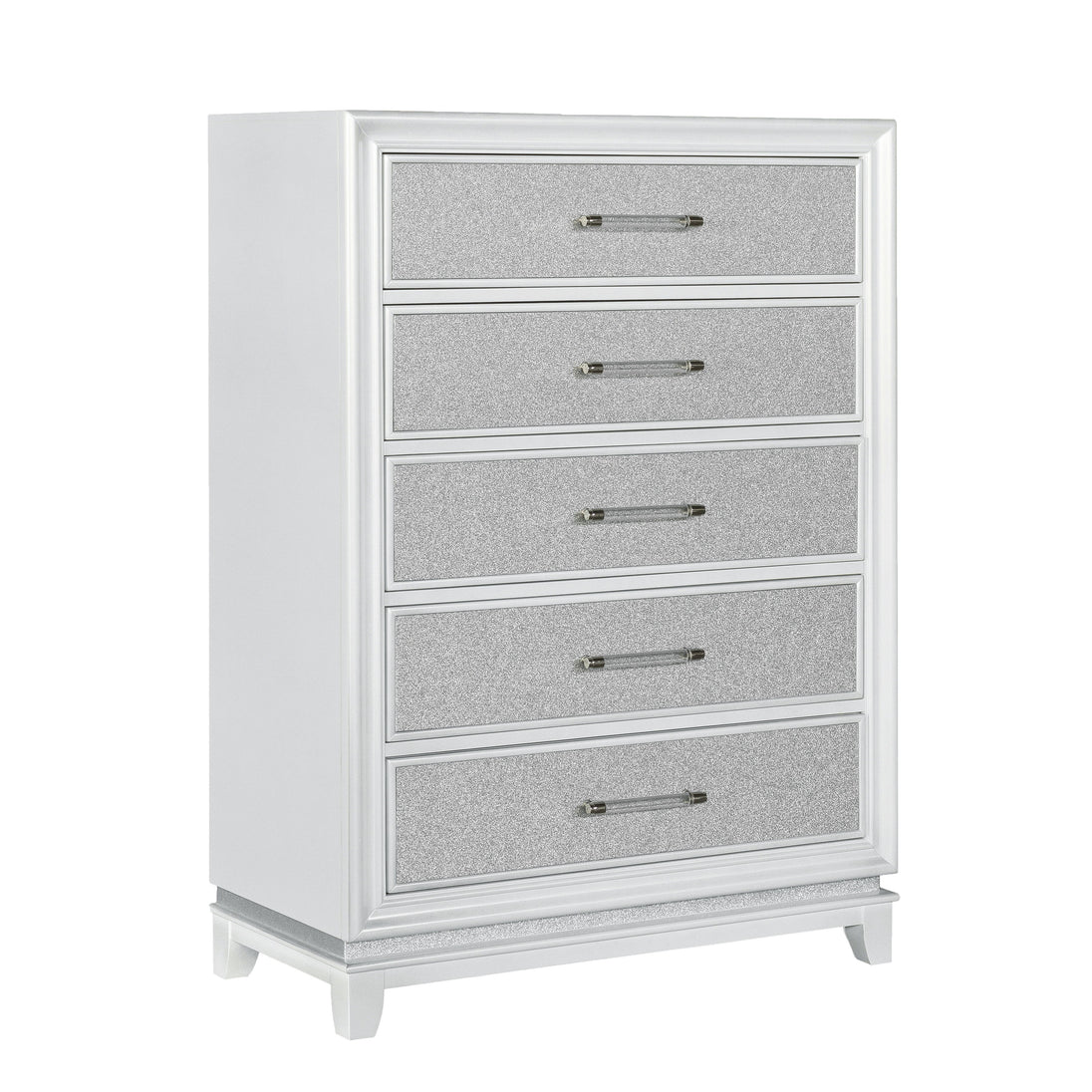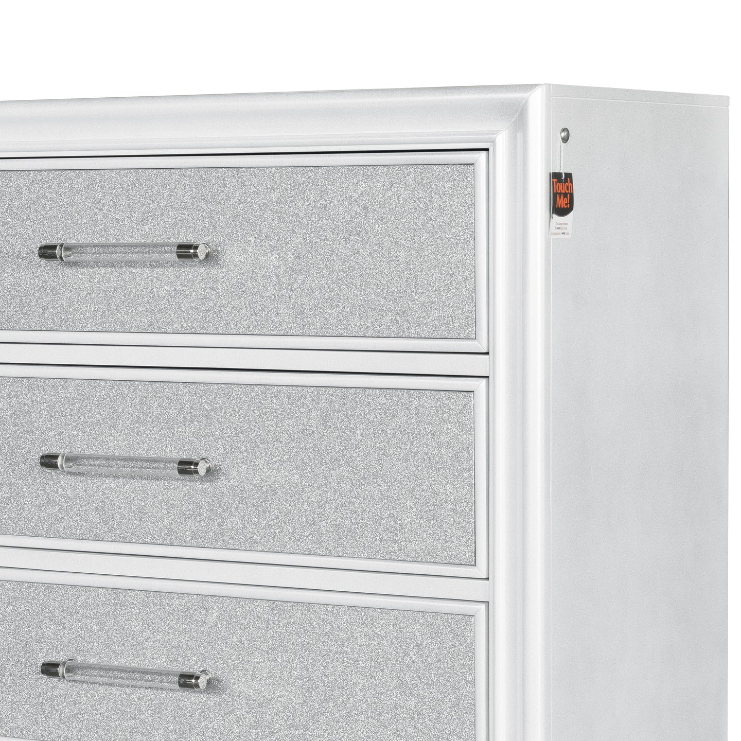 - Pearlized white finish with glitzy fabric on drawer fronts and a painted finished back