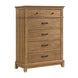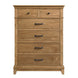 The Sunstone Chest combines durable, quality construction with solid rubberwood, manufactured woods, and hickory wood veneers, creating a strong and stable five-drawer chest. This collection features a classic, rustic style with natural wood finishes and clean, simple lines, complemented by neutral tones and a minimalistic design that fosters a serene and inviting atmosphere. The clear, natural finish, achieved through a hand-applied stain, enhances the wood's grain patterns and characteristics. The chest's elegant design includes a raised base, full return moldings, and contrasting hardware, adding a sophisticated touch to any bedroom. Heirloom drawer quality is ensured with durable dovetail joinery, providing longevity and strength, while three-stage steel ball glides allow for smooth, full-extension operation and support for heavy loads. Functional extras include five spacious drawers for ample clothing storage and a velvet-lined top drawer to protect delicate items. The Sunstone Chest is a practical and stylish addition, offering both timeless design and optimal functionality for your bedroom.