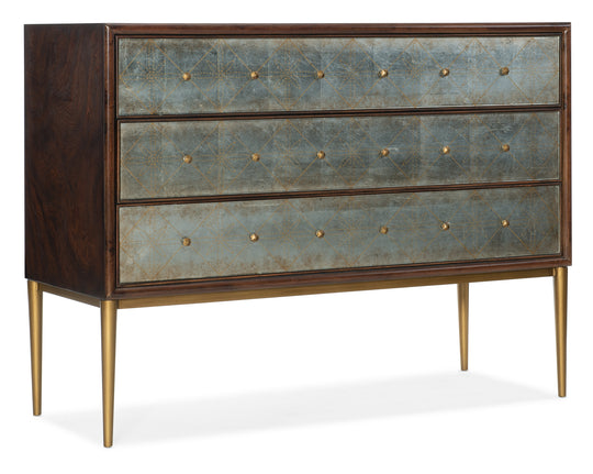 Melange Estrella Three Drawer Chest Tasteful and timeless, the Estrella Three-Drawer Chest is crafted of Swirl Mahogany with Glass, Silver Leaf and Metal and combines a dark wood finish with silver eglomise glass front doors and slim gold legs. The drawers...Regular price $4,089.00Regular price $4,089.00