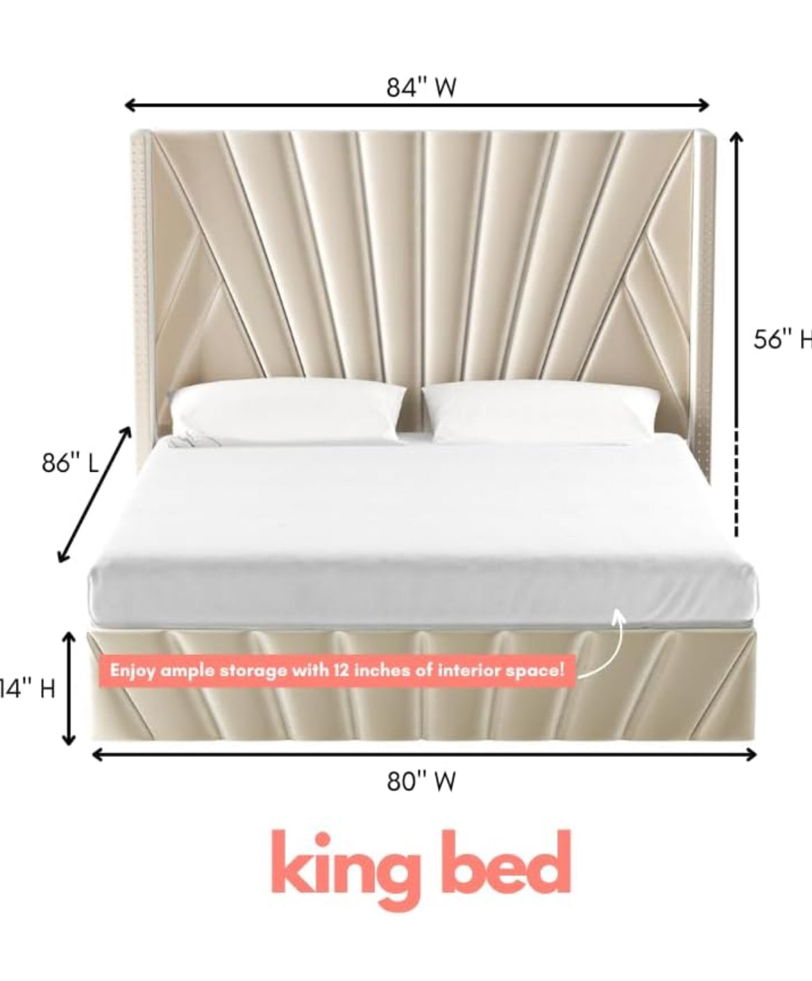 - King is a low profile spacious bed with the King size dimensions of 86'' Length x 84'' Width x 56'' Headboard Height