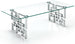 Enjoy a contemporary look in your living room or den with this stylishly elegant Alexis chrome coffee table. This Meridian Furniture table is made from glass and metal for a sleek, modish look. The base features a geometric design with intertwined squares that form two pedestals. The top is crafted from thick, clear glass that allows the beauty of the base to shine through completely. A chromed finish shores up the design, adding to its up-to-the-minute feel.