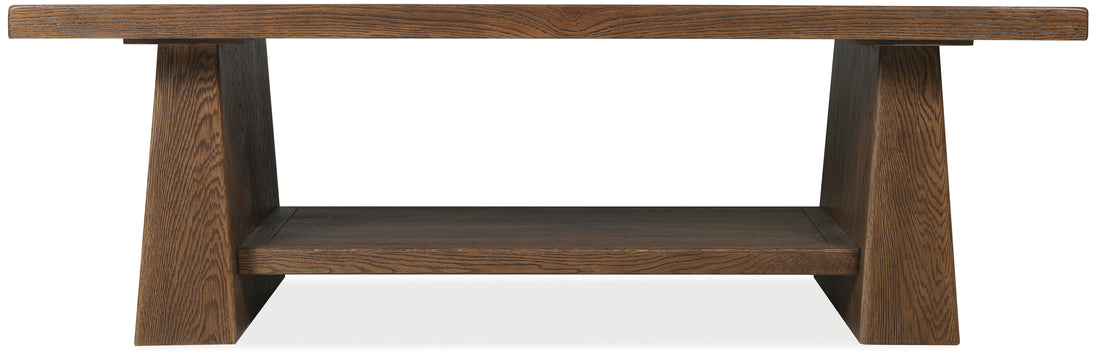 The Worn Saddle finish brings a rich, burnished depth to this rectangular cocktail table. A double pedestal base provides a bold foundation, while the lower fixed shelf offers additional functionality. Made with oak solids and veneers, it’s a piece that’s both timeless and versatile.