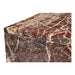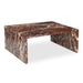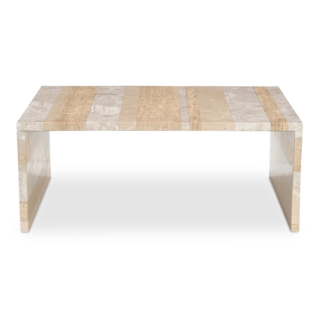 The bold simplicity of the waterfall design speaks volumes with the Rosa coffee table's versatility. The table is singularly impactful and crafted from beautiful sections of different types of neutral-toned marble with a generous scale and thickness to create a substantial look. This piece commands attention as a statement of natural elegance.