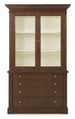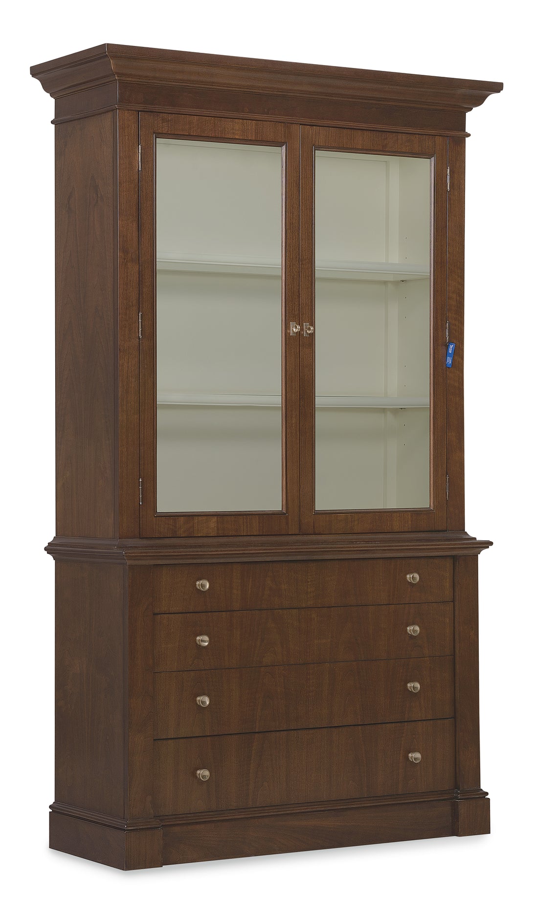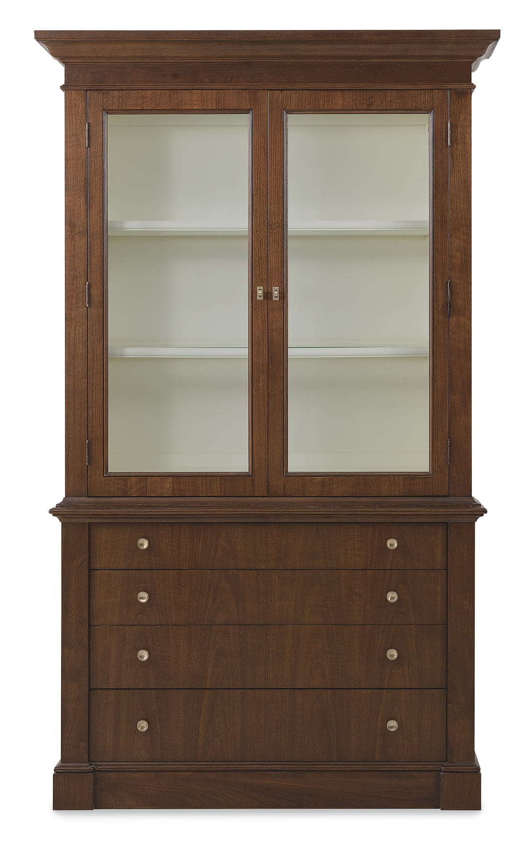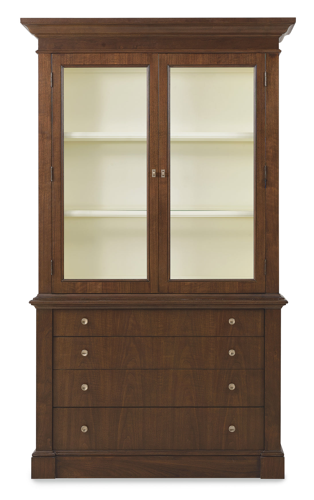 The Archives Display Cabinet is a statement piece for showcasing your finest collectibles, featuring cathedral figured walnut veneers, and tempered glass. The high clarity Classic Walnut finish, paired with satin brass hardware, adds a refined touch, while the cream-colored interior creates a stunning contrast. LED touch-activated lights illuminate your treasures, which are housed behind two wood-framed glass doors. With adjustable shelves and additional storage in the base, this cabinet is the epitome of elegance for a formal dining space or living room.