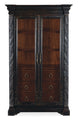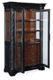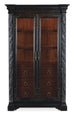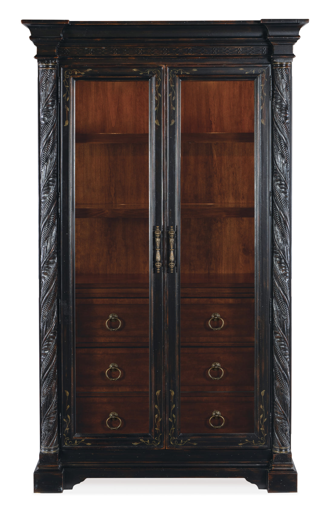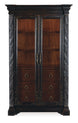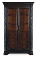 Stately and stunning, the two-tone Charleston Display Cabinet is inspired by the tropical craftsmanship of the West Indies and classic British and Dutch Colonial design. Intricately-carved botanical motif end posts and the tops and sides of the case are finished in the vibrant Black Cherry, while the interior and drawer fronts are finished in Maraschino Cherry using natural grain Cherry Veneers. There are handpainted leaf accents on the corners of the doors, decorative bar pulls and ring pulls in an antique bronze color. This functional piece has two full-length tempered glass doors, 3 self-closing drawers inside, two adjustable wood-framed glass shelves with plate grooves, one pullout work surface and two puck lights in the top with a 3-intensity touch switch located on the right-side back panel.