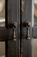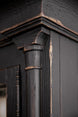 - Finish: Black finish with distressing including wormholes, rasping, multi-layer rub through, and emulsion. Burnished brass hardware.
