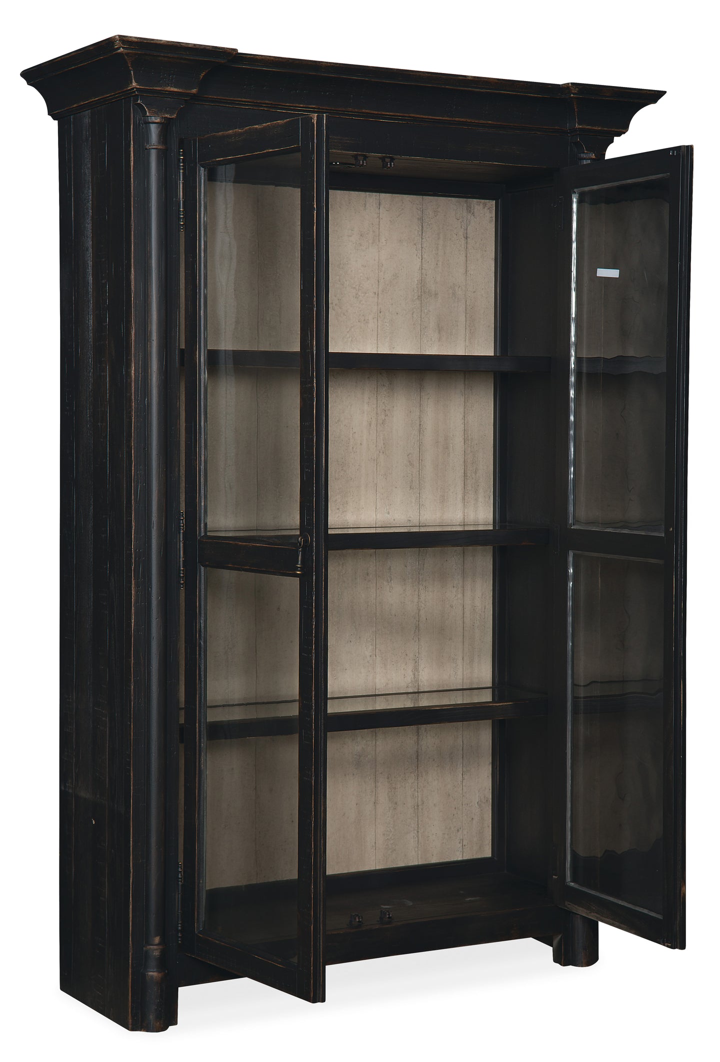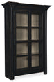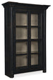 The striking silhouette of the two-door Ciao Bella Display Cabinet with wood-framed beveled glass doors will bring the character of European farmhouses to your home. Crafted of Pine, Poplar and Hardwood Solids with Maple and Pine Veneers, the exquisite black finish looks like it has aged through generations. As practical as it is pretty, the display cabinet has 2 adjustable wood-framed glass shelves and one fixed wood-framed glass shelf. The burnished brass hardware is tear-drop shaped.