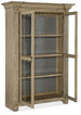 The striking silhouette of the two-door Ciao Bella Display Cabinet with wood-framed beveled glass doors will bring the character of European farmhouses to your home. Crafted of Pine, Poplar and Hardwood Solids with Maple and Pine Veneers, the Natural finish looks like it has aged through generations. As practical as it is pretty, the display cabinet has 2 adjustable wood-framed glass shelves and one fixed wood-framed glass shelf. The burnished brass hardware is tear-drop shaped.