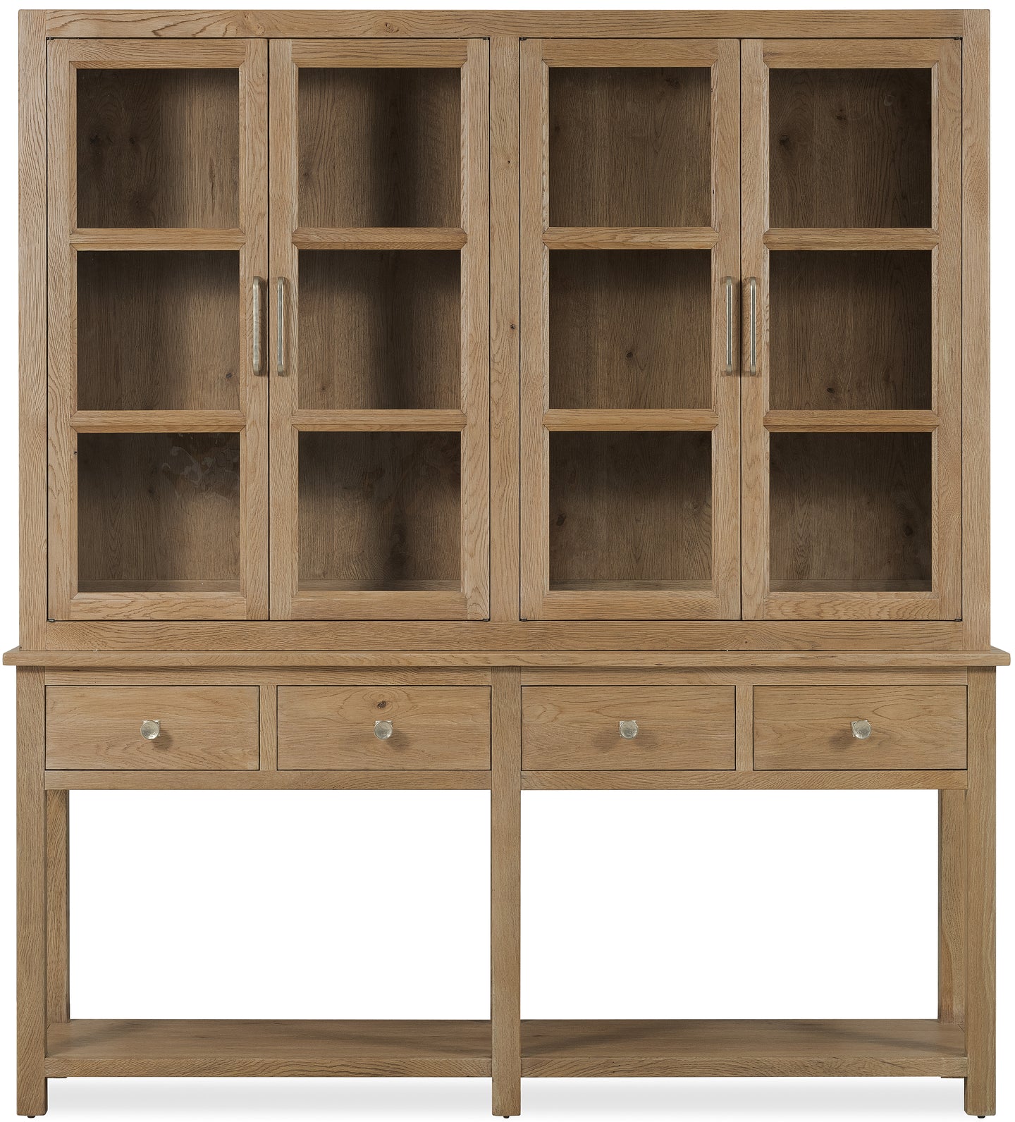 The Driftwood Display Sideboard in the Buckboard finish offers a warm, sun-faded oak tone that complements rustic yet refined dining spaces. Four wood-framed glass doors with magnetic catches open to reveal adjustable shelves with plate grooves for elegant dishware displays. Four self-closing drawers, including a removable silverware tray, provide thoughtful storage solutions. The sideboard’s design highlights heritage craftsmanship, while the Buckboard finish evokes the inviting character of naturally weathered wood.