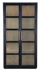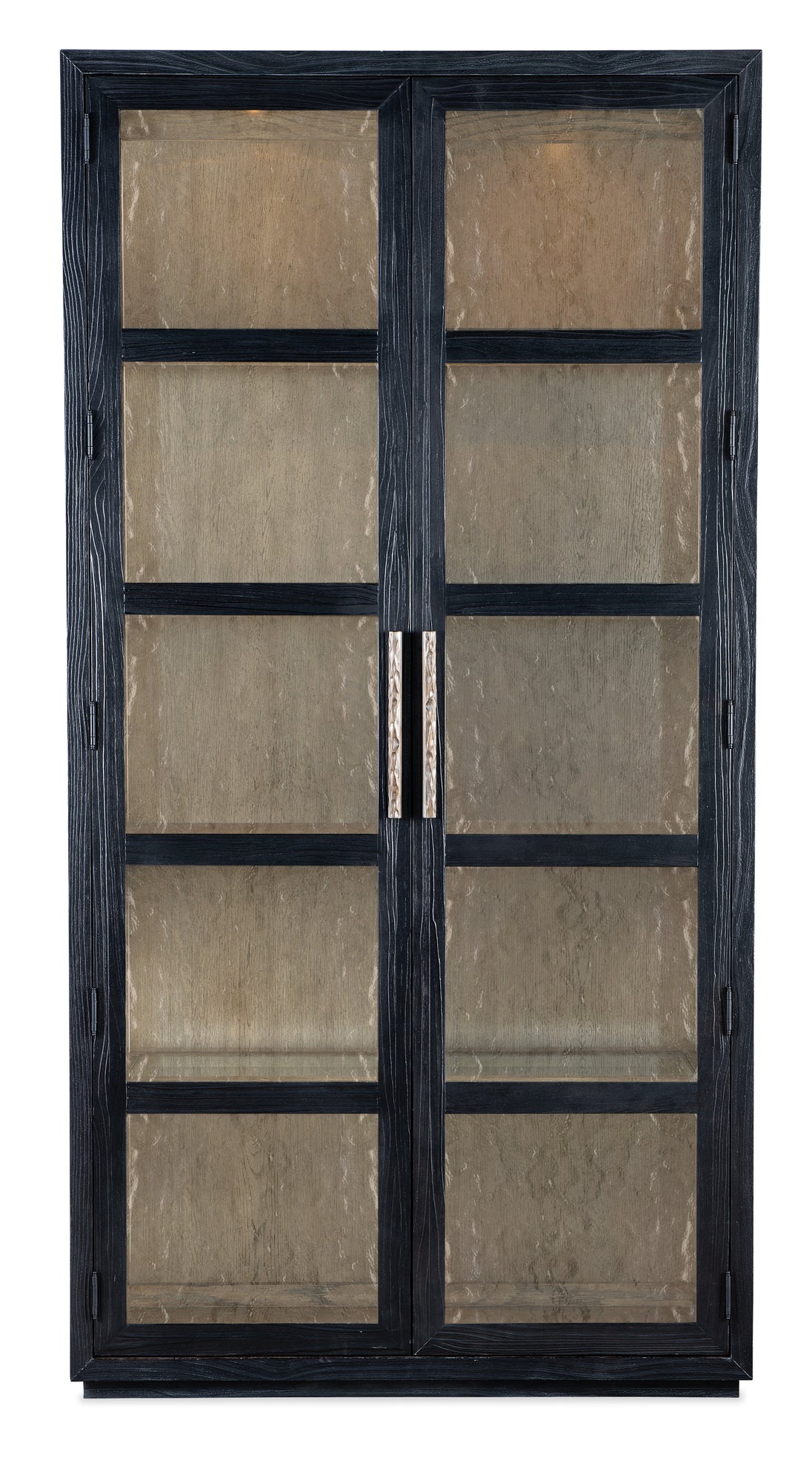 With the aura of a rustic mountain cottage, the Linville Falls Curio Cabinet has two wood-framed doors with seeded glass inserts. Crafted of Pine Veneers, the cabinet has a charred black finish achieved through Shou Sugi Ban, a Japanese technique that creates a look resembling burnt wood. The interior is finished in Mink, a soft smoked gray. There are three adjustable wood-framed glass shelves, one fixed wood-framed glass shelf and two puck lights in the top with a three-intensity touch switch on the right side back panel. Textured metal bar pulls have an antique pewter finish.