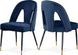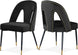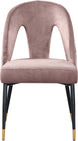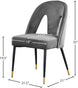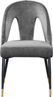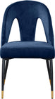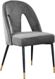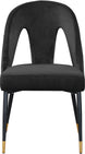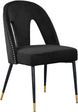 Modern and traditional elements collide in the design of this Akoya Velvet Dining Chair. Velvet upholstery covers the back and seat, giving it a decidedly glamorous look while two strategic cutouts provide just a hint of bold, modish fun. The gold nailhead trim on the back adds an edgy vibe, and metal legs in a black finish with goldtone tips rounds out the dining chair providing sturdy support and a contemporary look.
