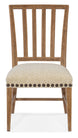 Inspired by the natural beauty of the American wilderness, the Big Sky Side Chair has a stylized spindle back, shaped wood legs and 3 stretchers finished in Vintage Natural. The seat is covered in the Saxony Porcelain performance fabric, and oversized nailhead trim adds flair.