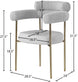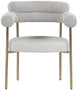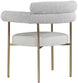 Comfort comes to mealtime with this Blake boucle fabric and vegan leather dining chair. This lovely chair is just the right choice for your modern dining room, with its curved back that cradles you in comfort while you wine and dine the night away. A thickly padded soft lack vegan leather seat lends this chair a sleek, upscale look while ensuring its ongoing performance and beauty. The chair's brushed brass finish protects its all-metal iron frame.