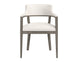 A mid-century modern dining armchair chair with an open back design. Stocked in linoso ivory fabric with an exposed ash grey solid oak wood frame. Also available in linoso light grey fabric with a dark brown oak frame, and in heather ivory tweed fabric with a natural oak frame. As wood is an organic, porous material, these pieces will contain natural variation of texture and may also exhibit fine indentations and cracks. Wood pieces will also display a disparity of colour and grain, and visible knots and burls that add to the character of each piece.