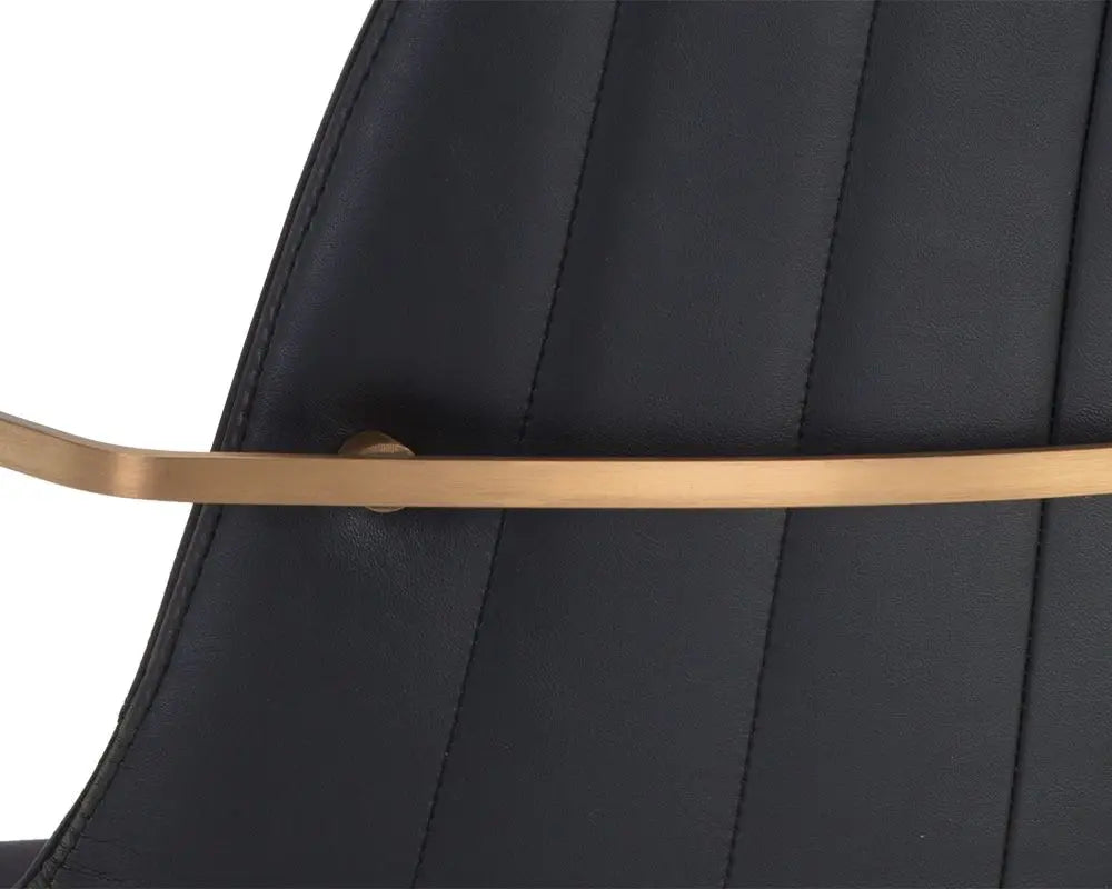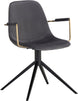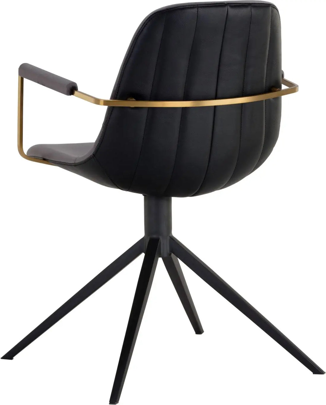 This swivel dining chair from is where urban cool meets contemporary elegance. Designed with an abbington black fabric seat and a channel tufted exterior in bravo black faux leather. Brushed gold finished arms and black iron legs complete this look. Also available in dillon cream faux leather and slate tint fabric with contrasting nightfall black faux leather.