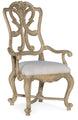 From the fleur-di-lis fretwork back to the scalloped apron to the curvaceous cabriole legs and X-stretcher, the Castella Wood Back Arm Chair is adorned with classic design details that make it a work of art. A neutral-colored performance fabric upholstery provides for hours of lingering comfortably at the table, while the Antique State finish has a beautiful patina and a look of laid-back luxury.