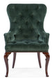 Grand and gracious, the exquisitely-scaled fully-upholstered Charleston Host Chair features delicate button-tufting on the seat and back and is accented with bronze nailhead and welt trim along the seat bottom and outside arms and back. The expansive cabriole legs are finished in Maraschino Cherry using natural grain Cherry Veneers showcasing the dramatic cathedral structure with the selective inclusion of naturally-occurring knots to deliver a rich warm cherry finish and a smooth sophisticated aesthetic.