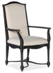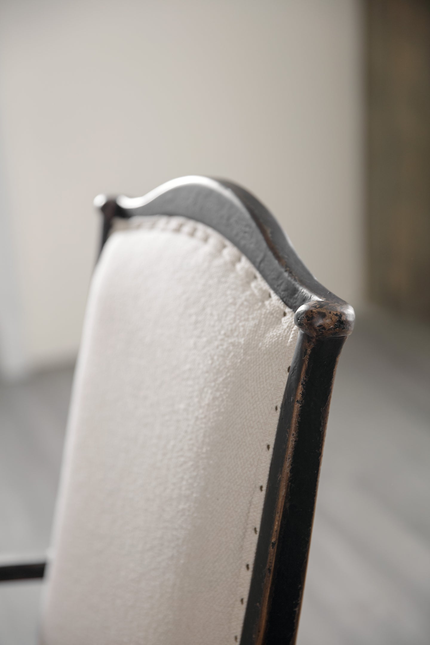 The delight is in the details of the Belgian-inspired Ciao Bella Upholstered Arm Chair. From the delicate, curved, intersecting stretcher base to the tiny tack-nail trim outlining the soft gray-white seat and back to the scalloped seat base, this versatile chair is timeless and inviting. The exquisite aged black complements the Tuscan gray-white fabric perfectly.