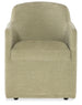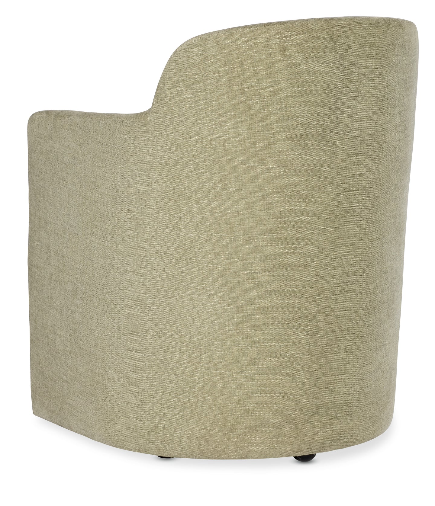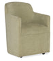 This version of the Izabela Upholstered Arm Chair is upholstered in Baso Sage, a 100% polyester performance fabric. With a fresh, green tone, it brings a pop of color to any dining room. The barrel-style design provides a sophisticated yet comfortable seating experience, and the addition of casters ensures easy mobility. Crafted for modern homes, the full fabric upholstery and quality wood construction add to its durability and style.