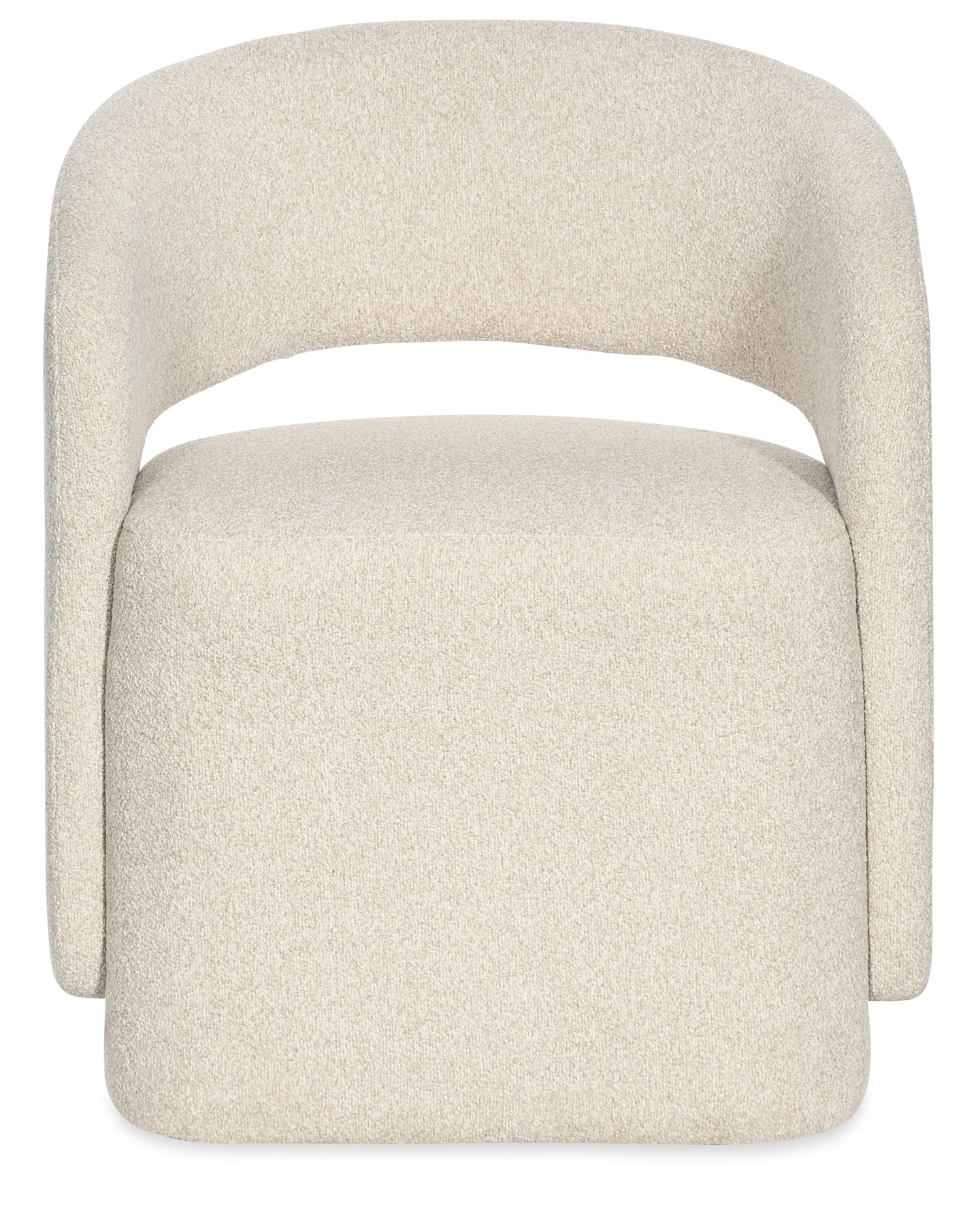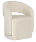 Softly rounded and fully upholstered, this arm chair features a barrel-style open back and plush Matera Pearl fabric. A stylish and comfortable companion to any modern dining table.