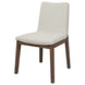 Gently sloped padded seat in a beige polyester blend fabric with a protected finish that resists soiling and stains. Rests within a solid wood frame finished in rich walnut. Seat height is 20". Packed 2 per box but priced individually. Must be purchased in increments of 2.