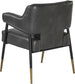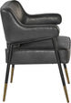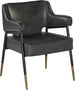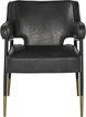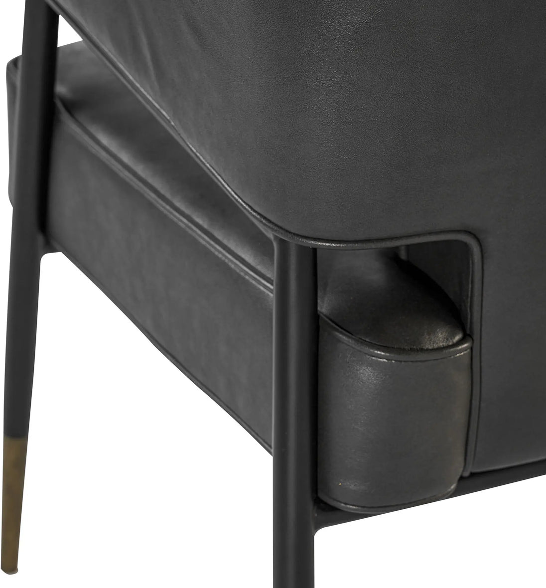 A contemporary armchair that sits comfortably. Features a sculpted silhouette upholstered in bravo admiral faux leather. Piping, black steel legs, and gold foot caps complete the look. Handle With Care: This design has been crafted with faux leather. Faux leather is manufactured to reflect the natural characteristics of leather; as such, colour variations, markings, wrinkles, grooves, and light scratches are appreciated characteristics. No two pieces will be alike. Visit our Product Care page for more information on how to ensure the lasting beauty of this piece.