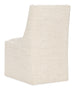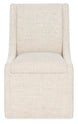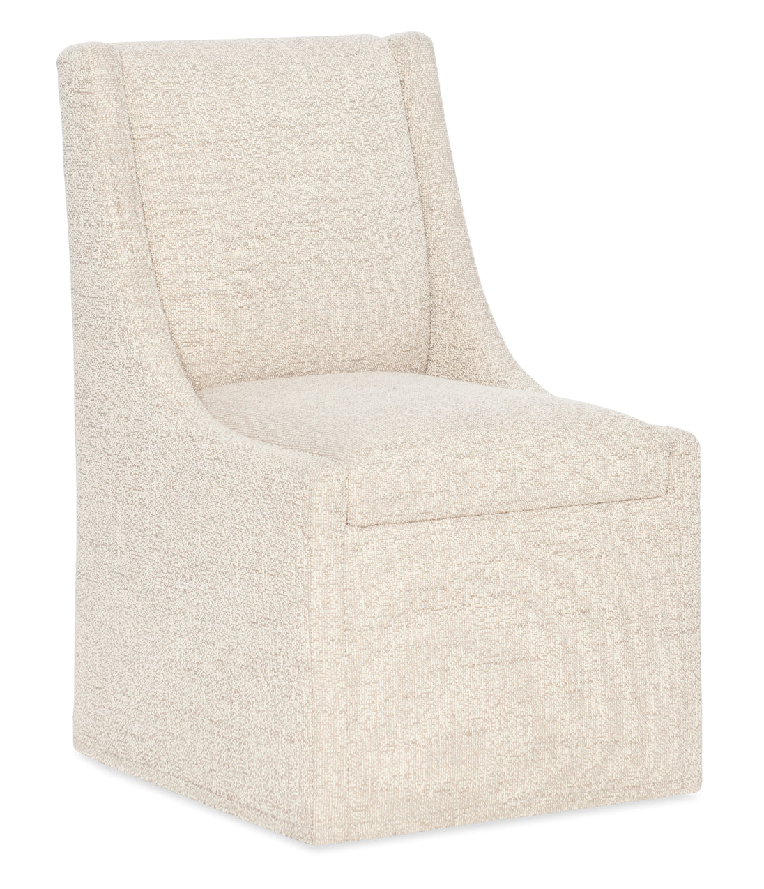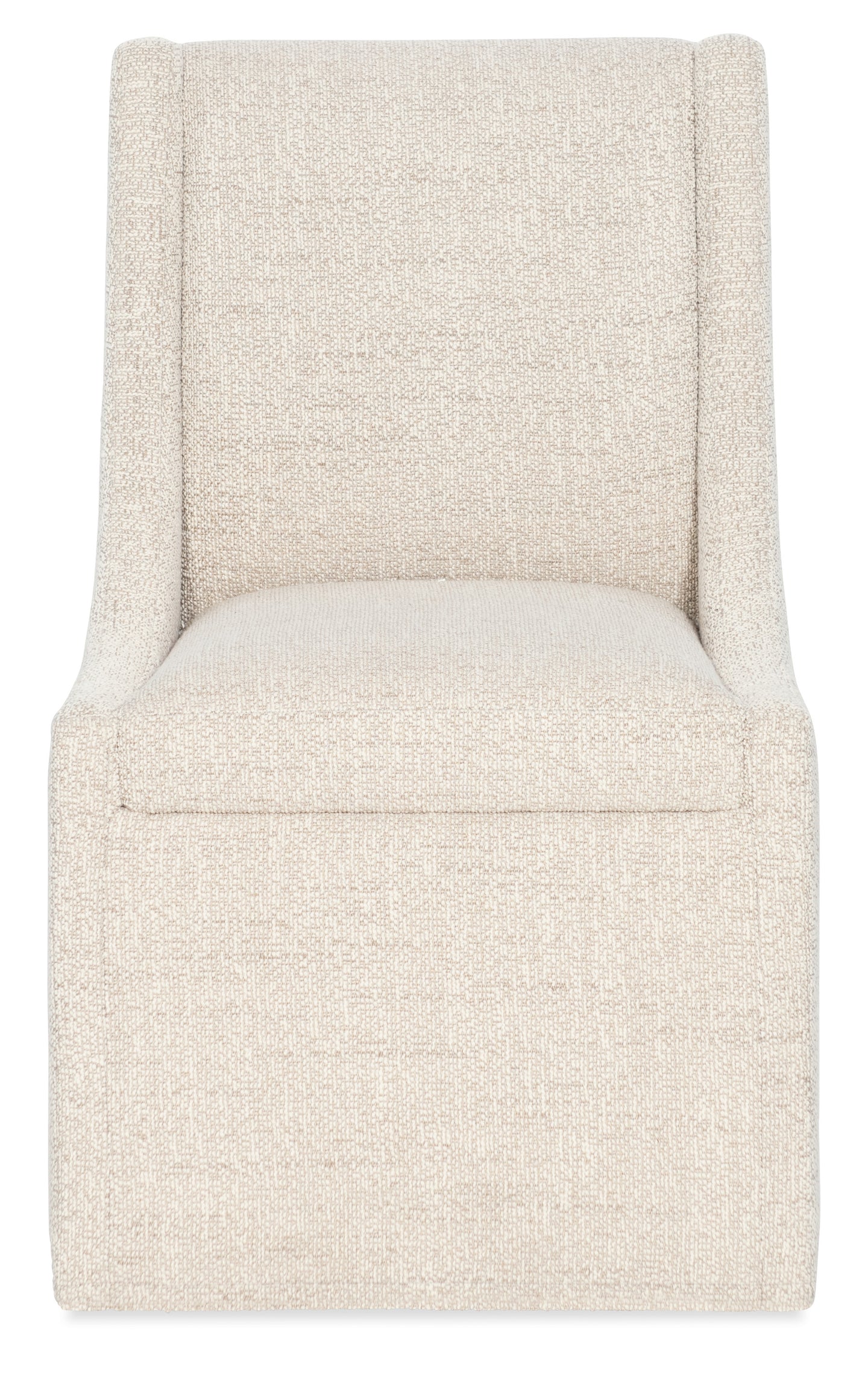 The Eleana Castered Side Chair delivers flexible seating with its low sloped track arms, beige fabric upholstery, and smooth casters for effortless movement. With its fully upholstered design, this chair combines casual elegance with functionality, making it ideal for transitional dining spaces.
