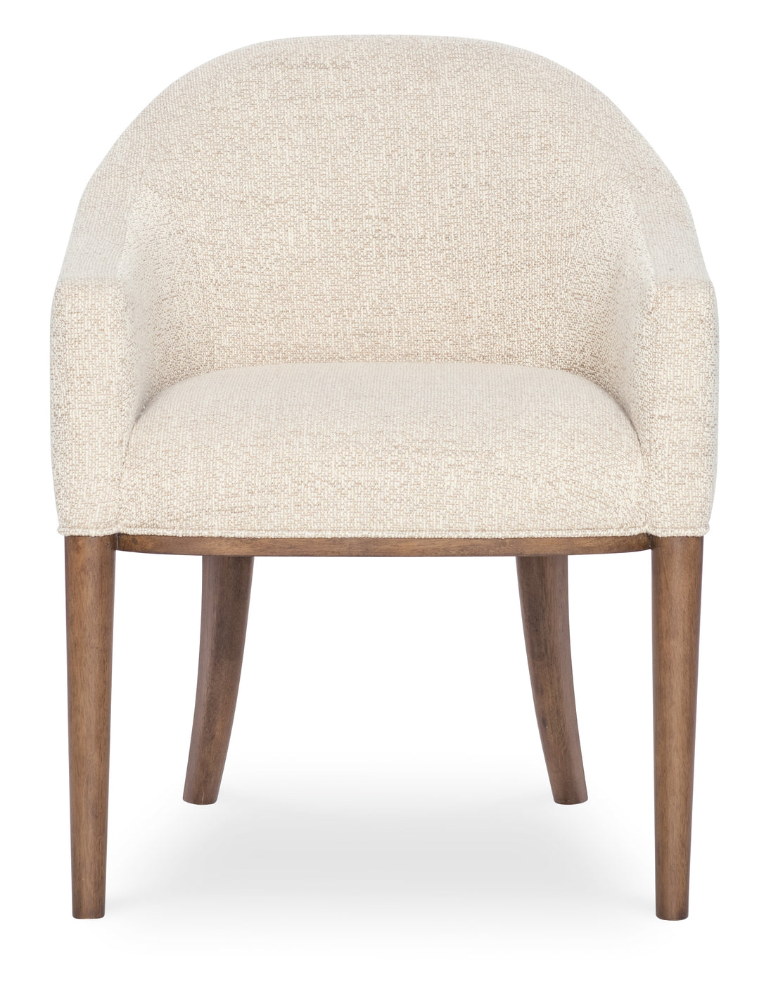 Elevate your dining setting with the Eleana Upholstered Arm Chair, crafted with a Light Caramel walnut veneer frame and beige fabric upholstery. The welt trim detailing and tapered wood legs exude sophistication, while the classic linen fabric blend (polyester, viscose, and linen) adds durability. Perfect for transitional dining rooms, this arm chair combines comfort and timeless elegance.