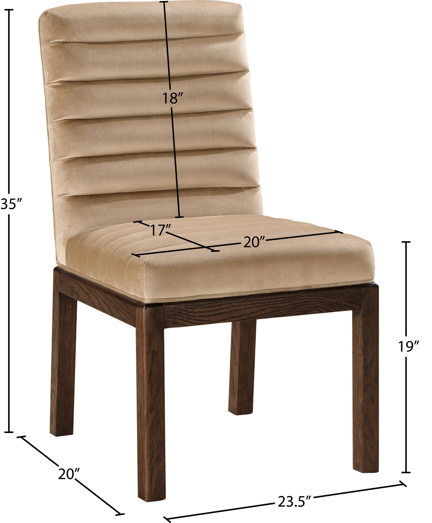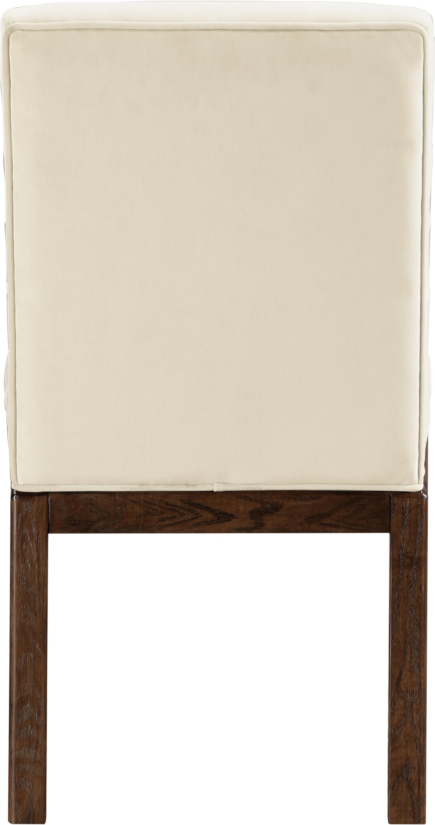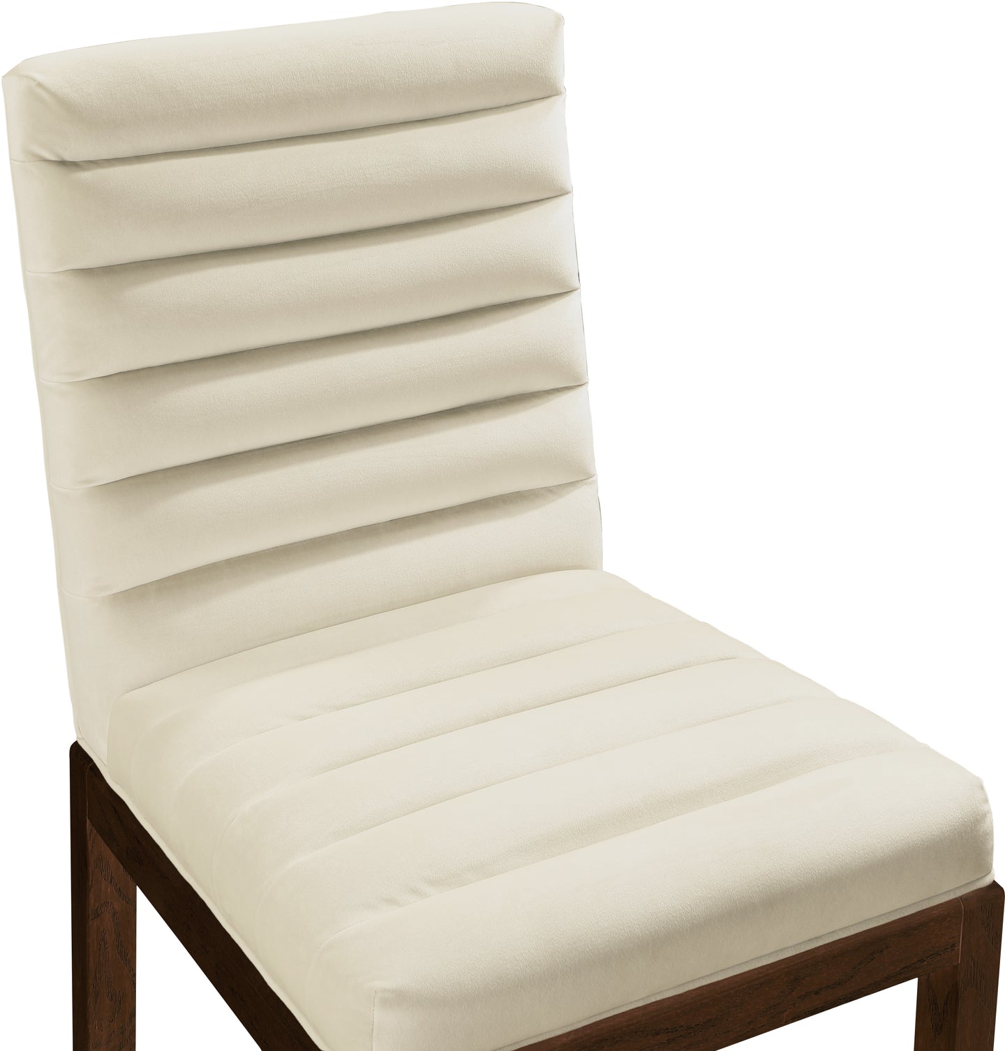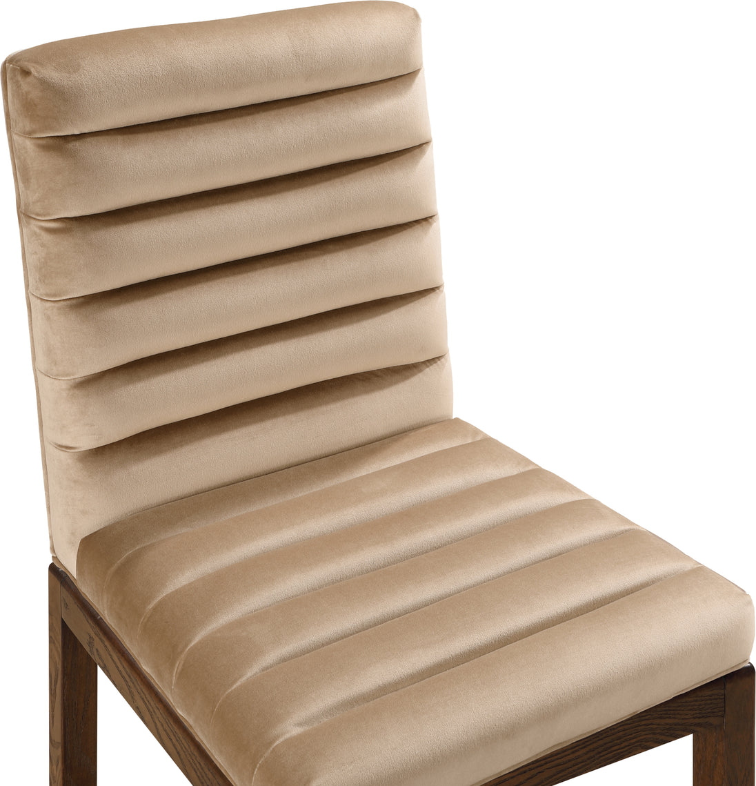 Transform your dining area with the Evelyn dining chair, featuring luxurious beige velvet upholstery. Supported by rich walnut brown ash wood legs and detailed with deep channel tufting, this chair exudes both durability and opulence. The 460 GSM velvet offers a sumptuous texture, while the contemporary design ensures it makes a striking addition to any space. This chair seamlessly blends style and comfort, perfect for creating a refined dining experience.