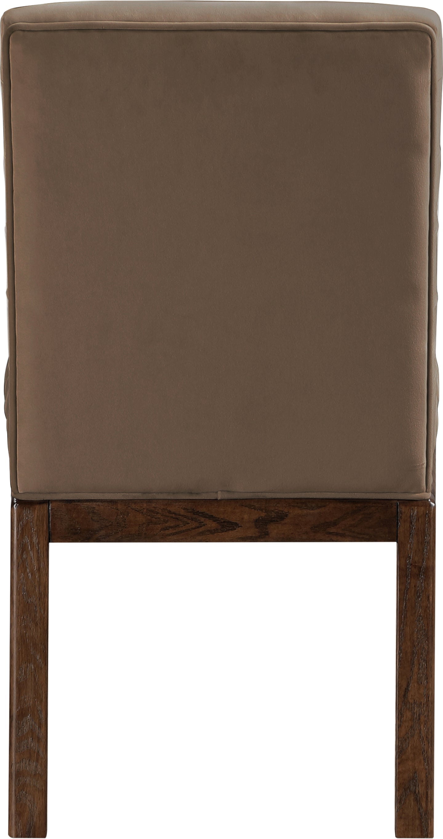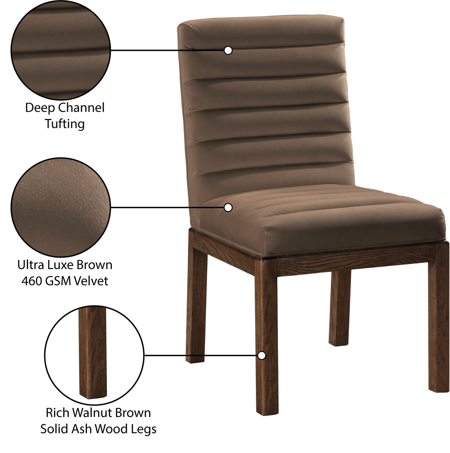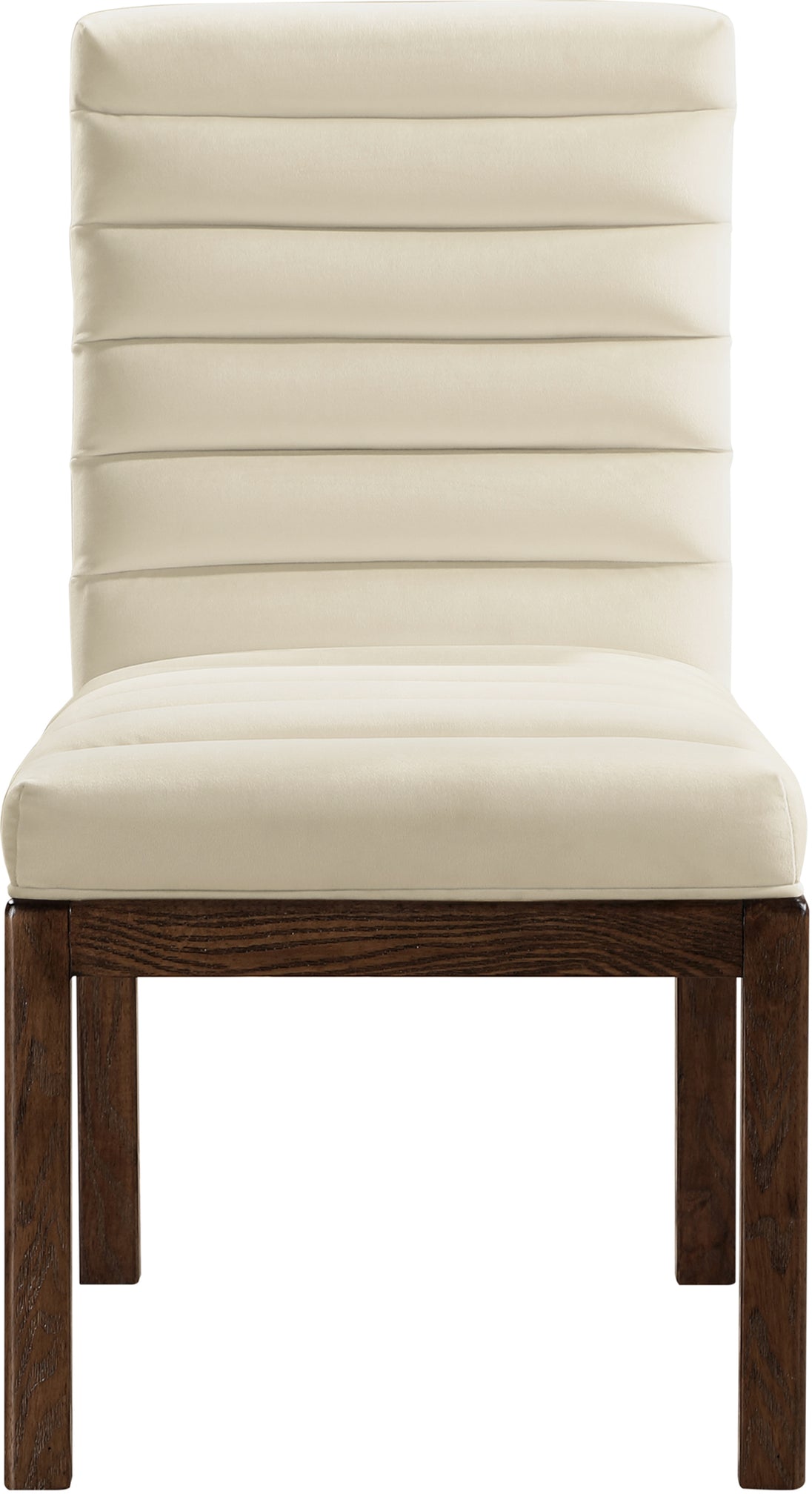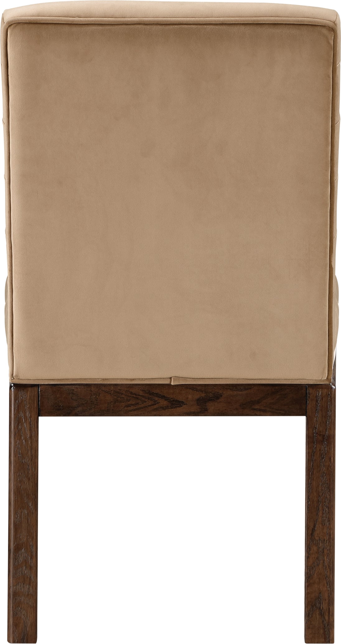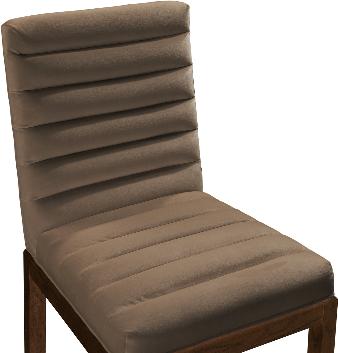 Transform your dining area with the Evelyn dining chair, featuring luxurious beige velvet upholstery. Supported by rich walnut brown ash wood legs and detailed with deep channel tufting, this chair exudes both durability and opulence. The 460 GSM velvet offers a sumptuous texture, while the contemporary design ensures it makes a striking addition to any space. This chair seamlessly blends style and comfort, perfect for creating a refined dining experience.