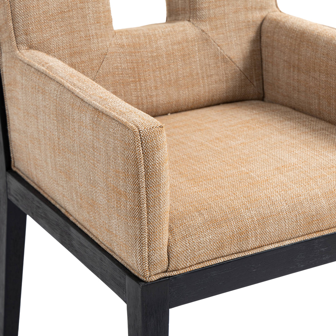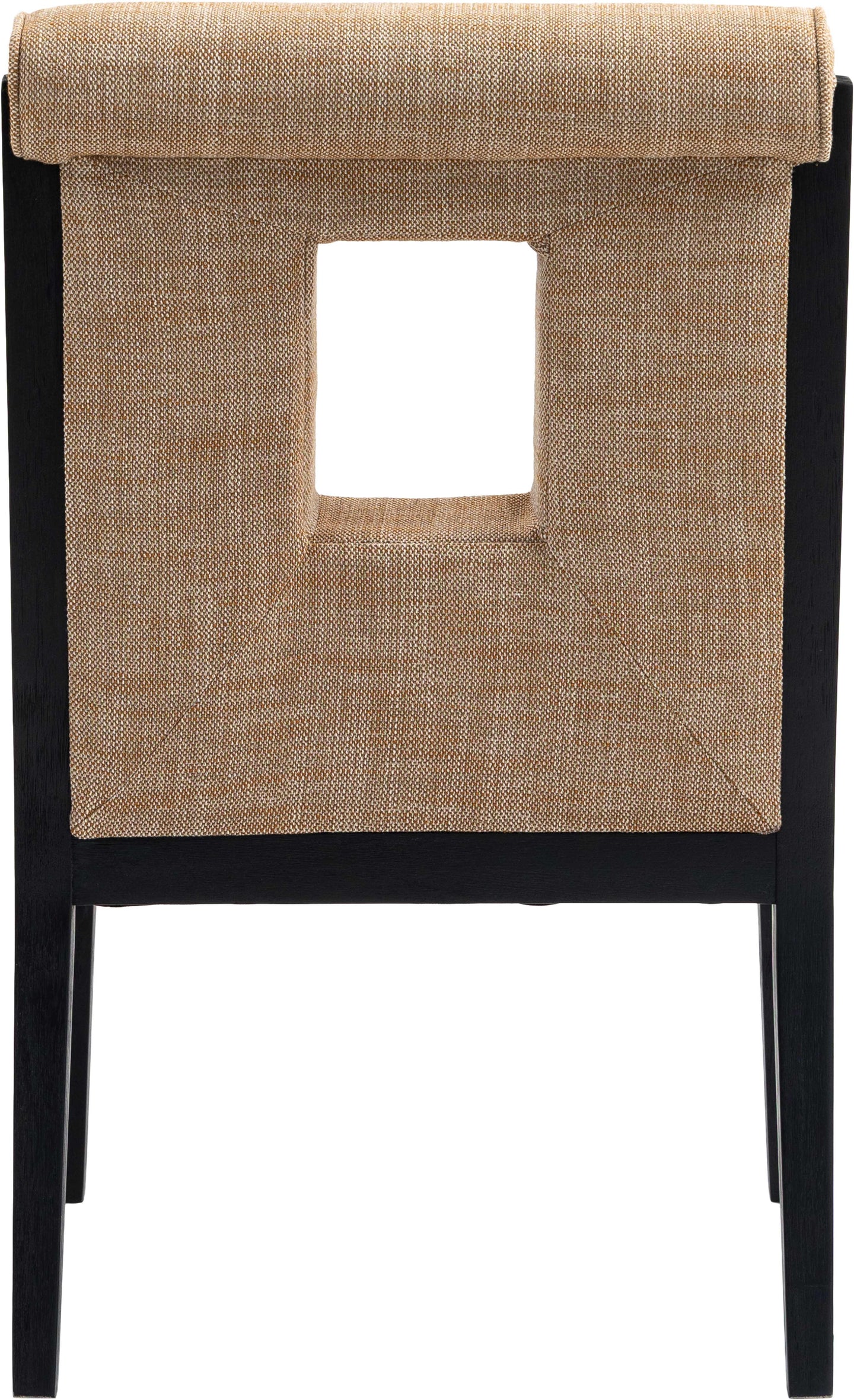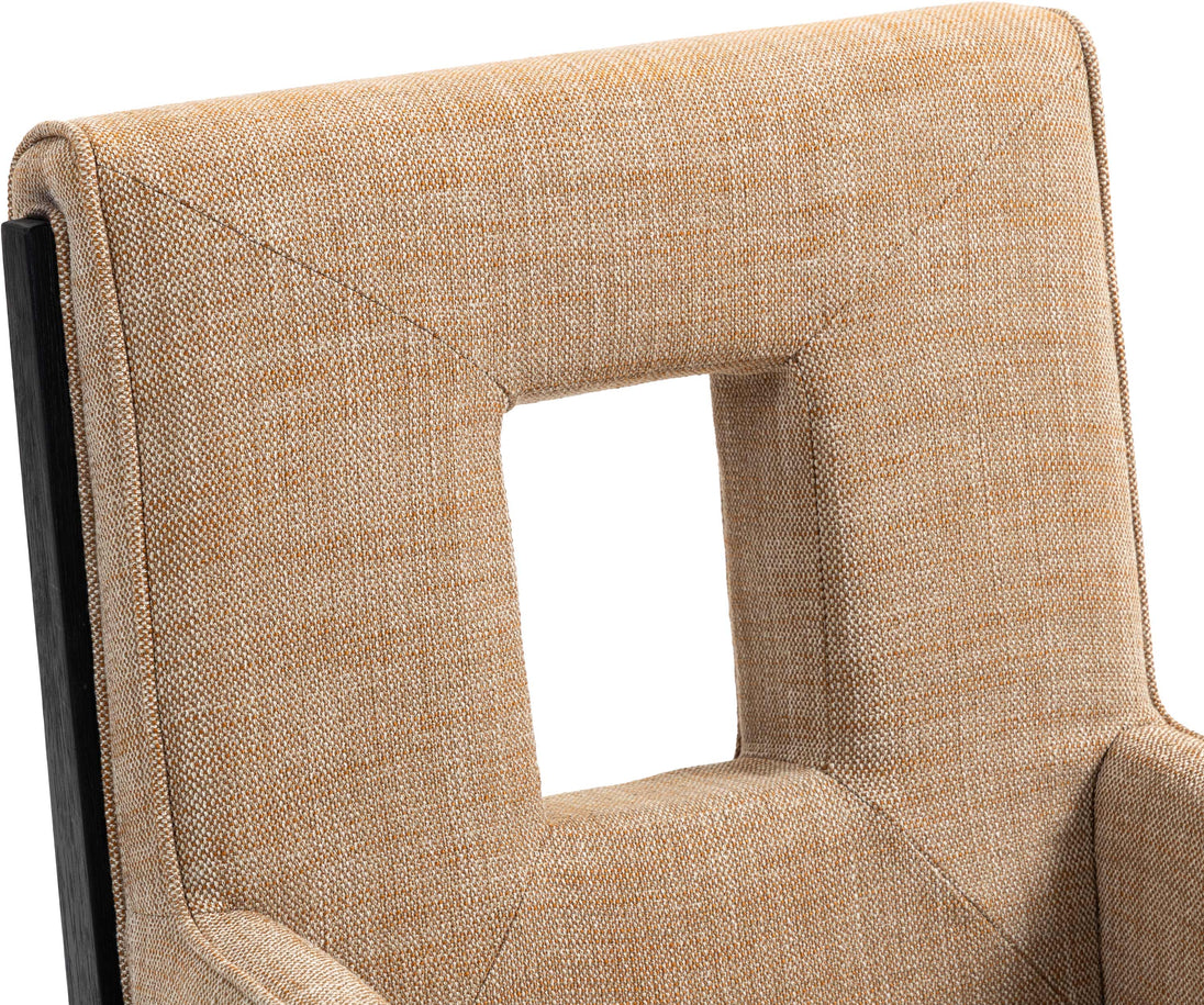 A masterpiece of modern elegance and comfort, the Gwendolyn cognac linen textured fabric dining armchair is where modern design meets timeless charm. Designed with comfort in mind, it features a high back and luxurious cushioning, perfect for long dinners or lively gatherings. The black wood frame adds a rustic touch, effortlessly balancing the contemporary fabric with a hint of warmth and tradition.