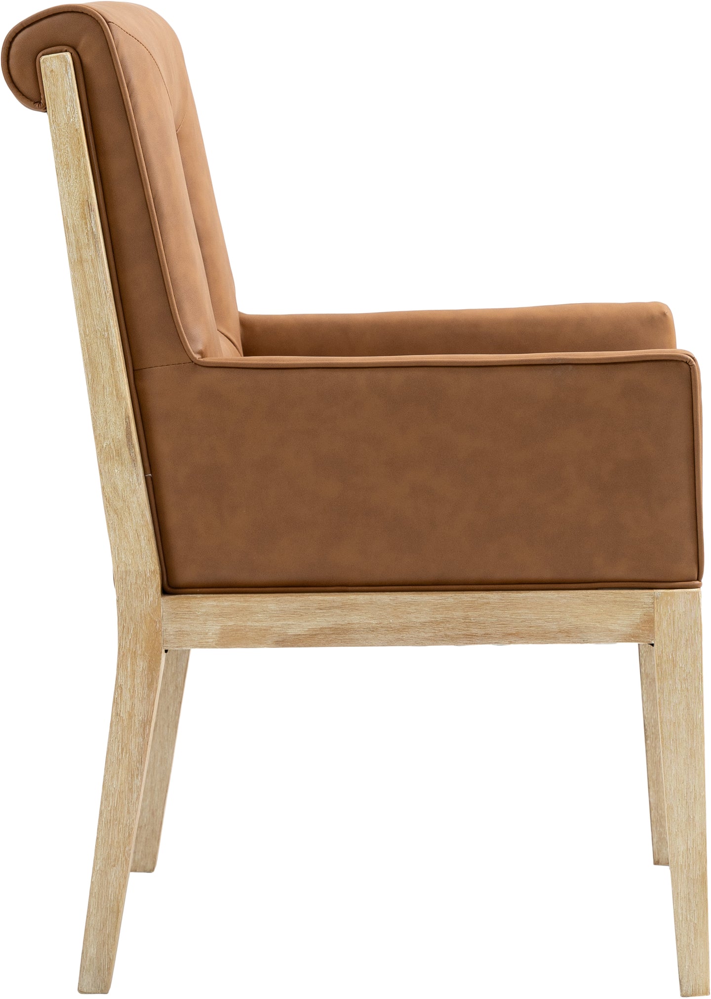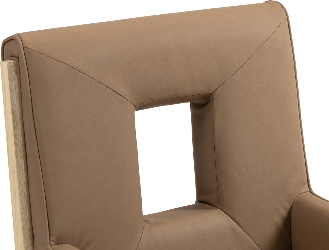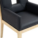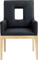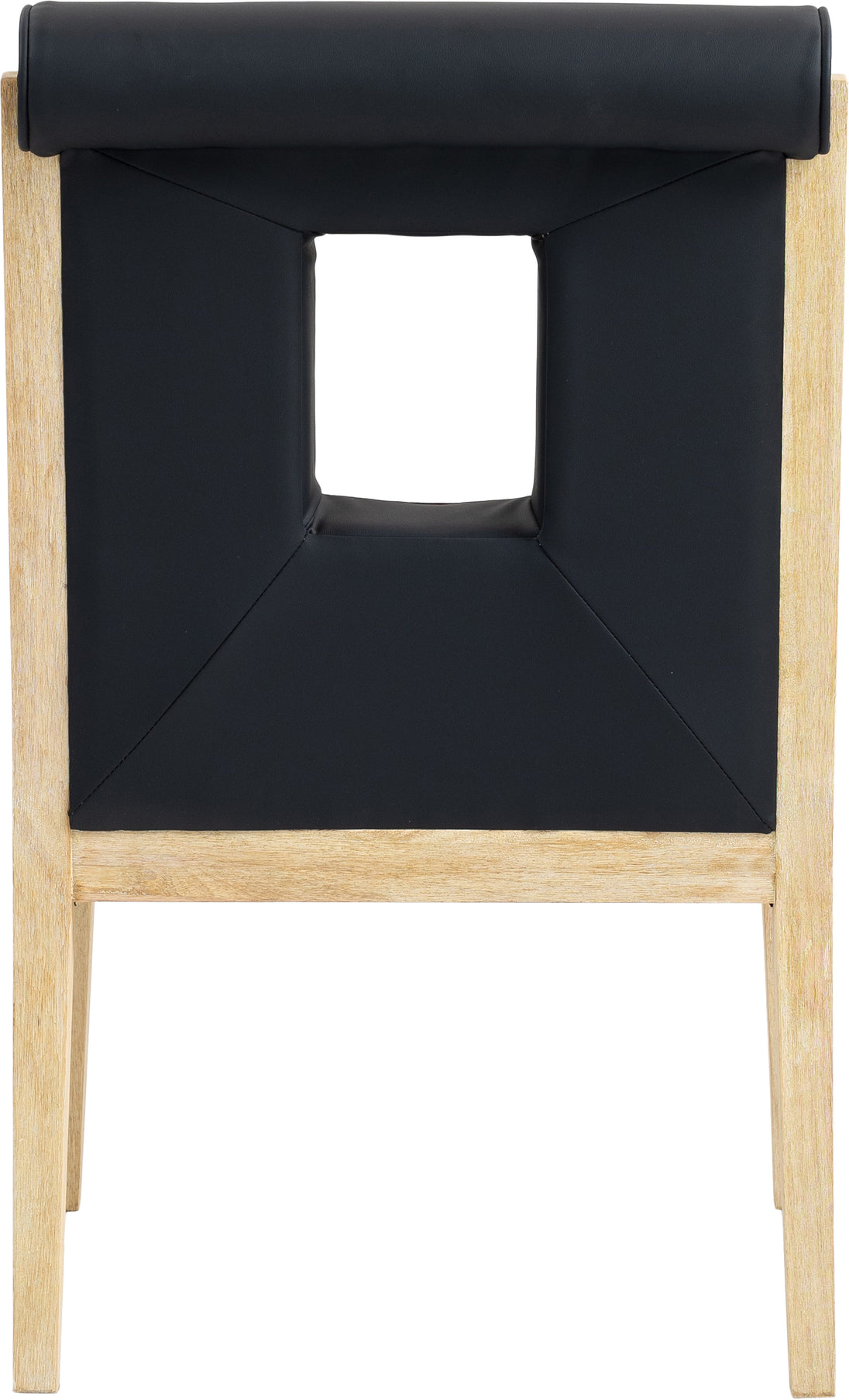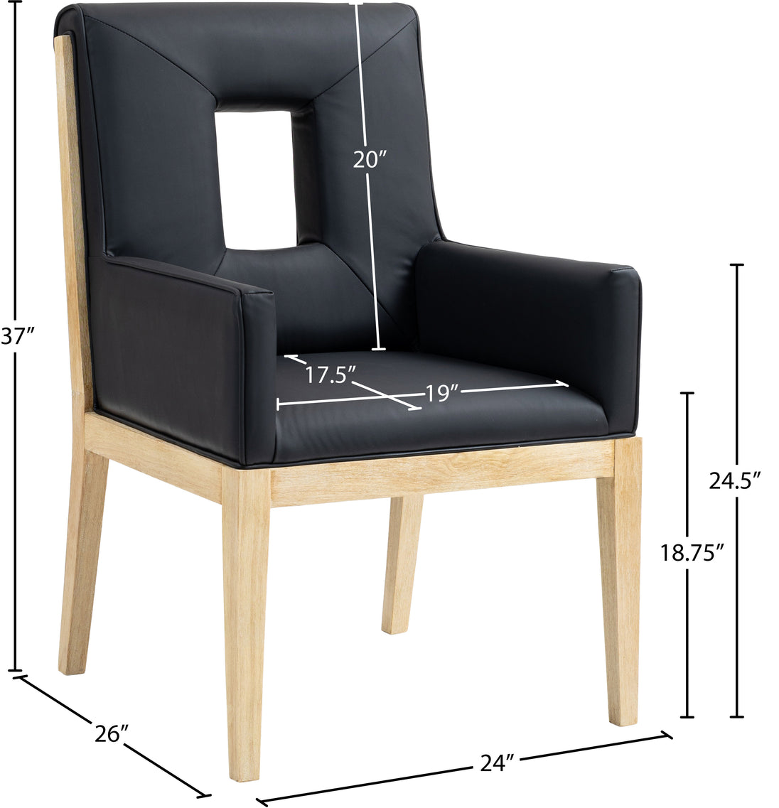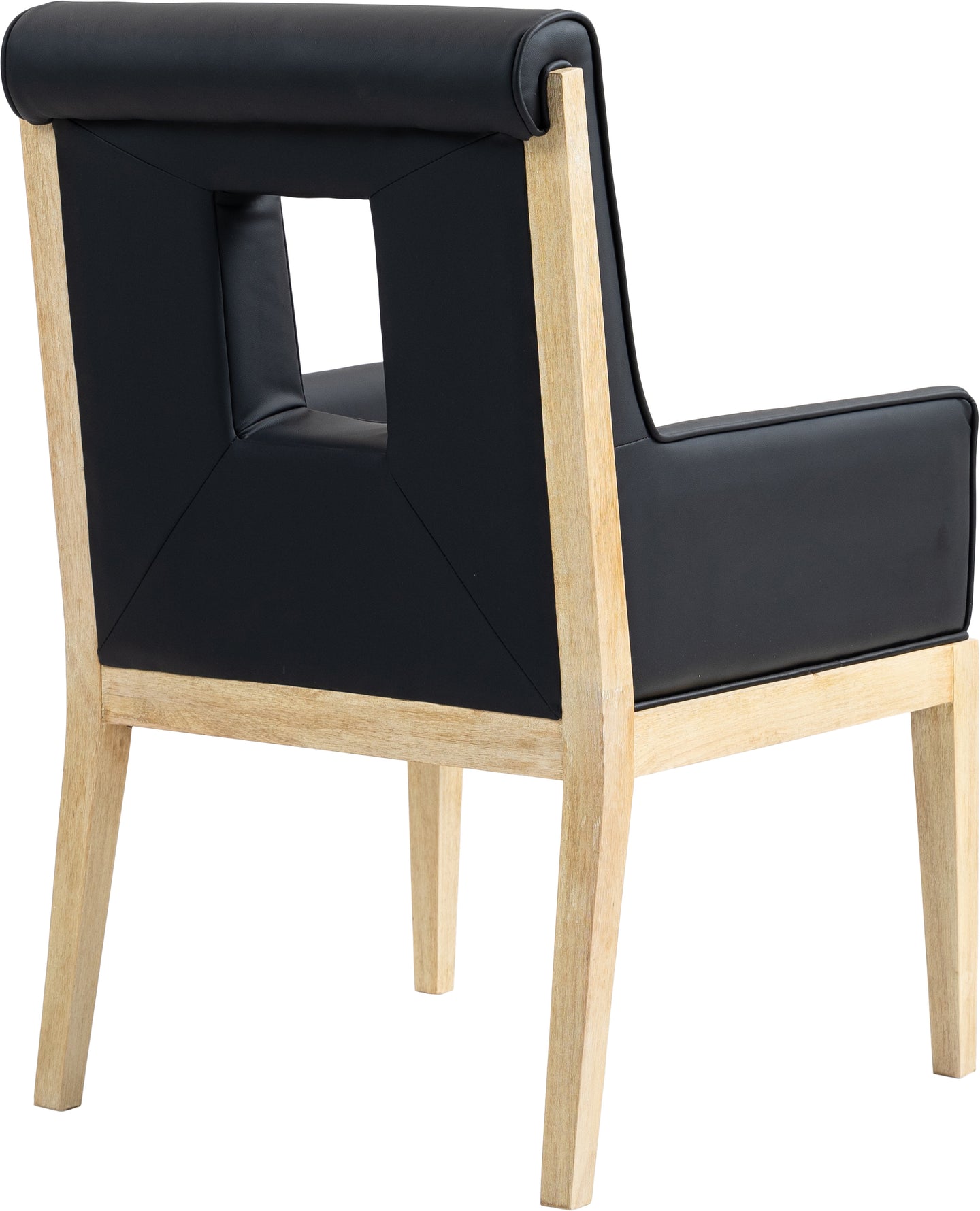 A masterpiece of modern elegance and comfort, the Gwendolyn black vegan leather dining armchair is where modern design meets timeless charm. Designed with comfort in mind, it features a high back and luxurious cushioning, perfect for long dinners or lively gatherings. The natural oak wood frame adds a rustic touch, effortlessly balancing the contemporary fabric with a hint of warmth and tradition.