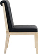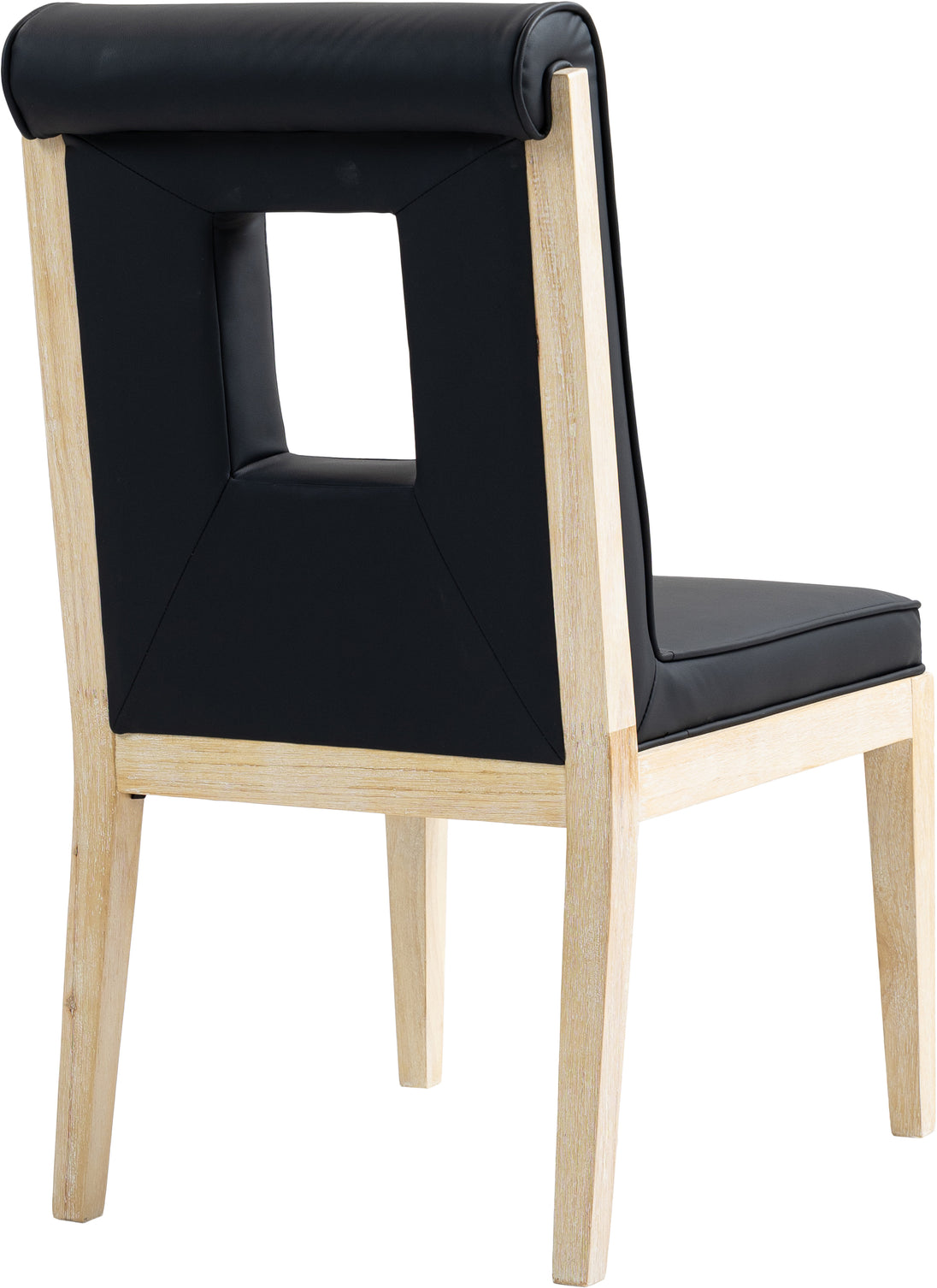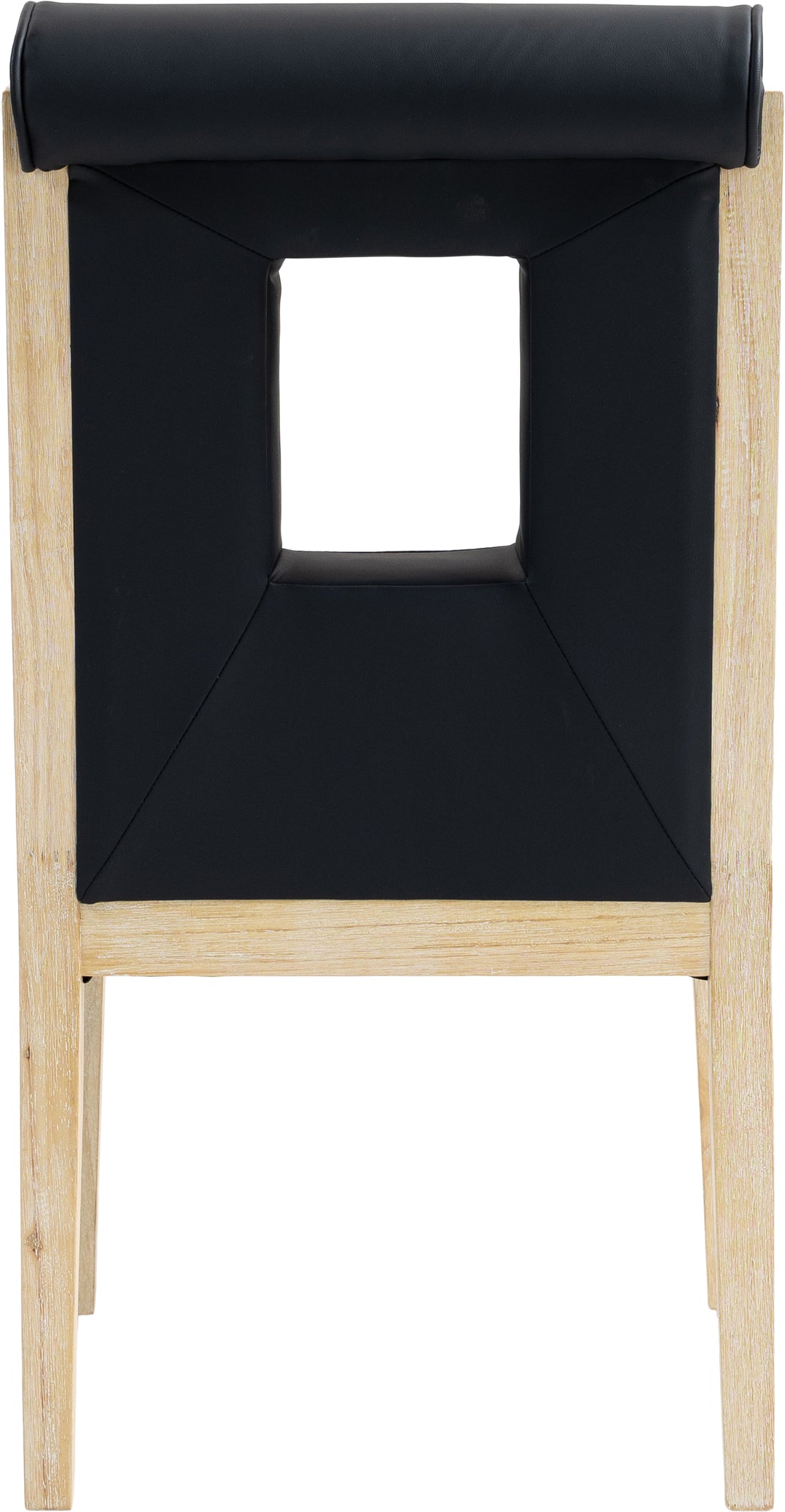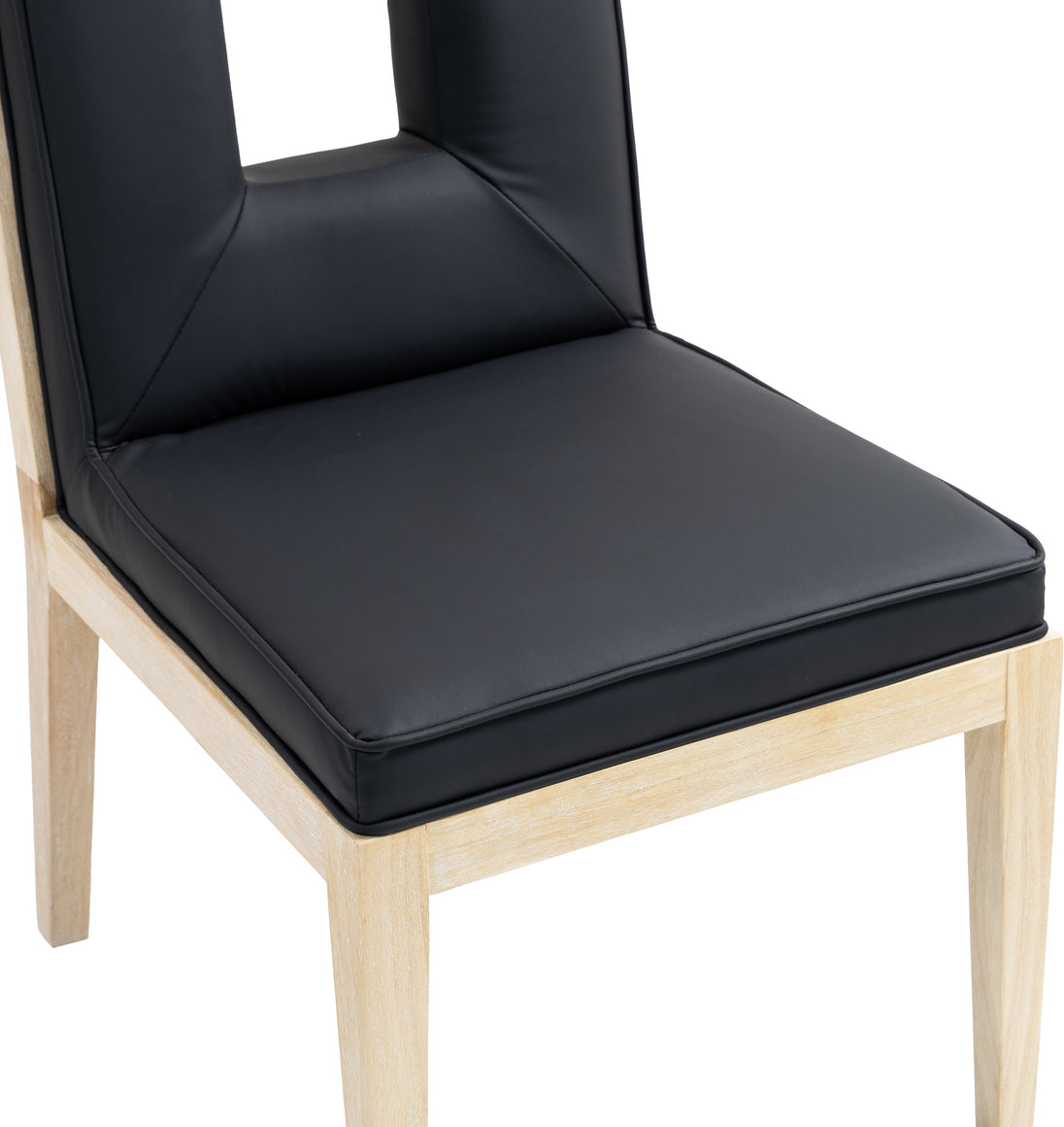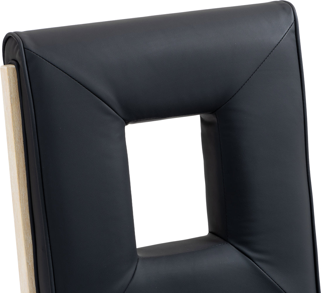 A masterpiece of modern elegance and comfort, the Gwendolyn black vegan leather dining side chair is where modern design meets timeless charm. Designed with comfort in mind, it features a high back and luxurious cushioning, perfect for long dinners or lively gatherings. The natural oak wood frame adds a rustic touch, effortlessly balancing the contemporary fabric with a hint of warmth and tradition.