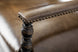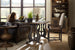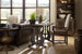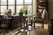 You will want to linger and gather for hours as you break bread or visit with family and friends in the Comfort Upholstered Arm Chair. The seat is upholstered in an aniline top grain leather, and the back is in a woven, desert-colored fabric, and both are accented with bronze nailhead trim. The bobbin-style stretchers and legs add authenticity.