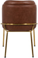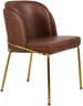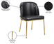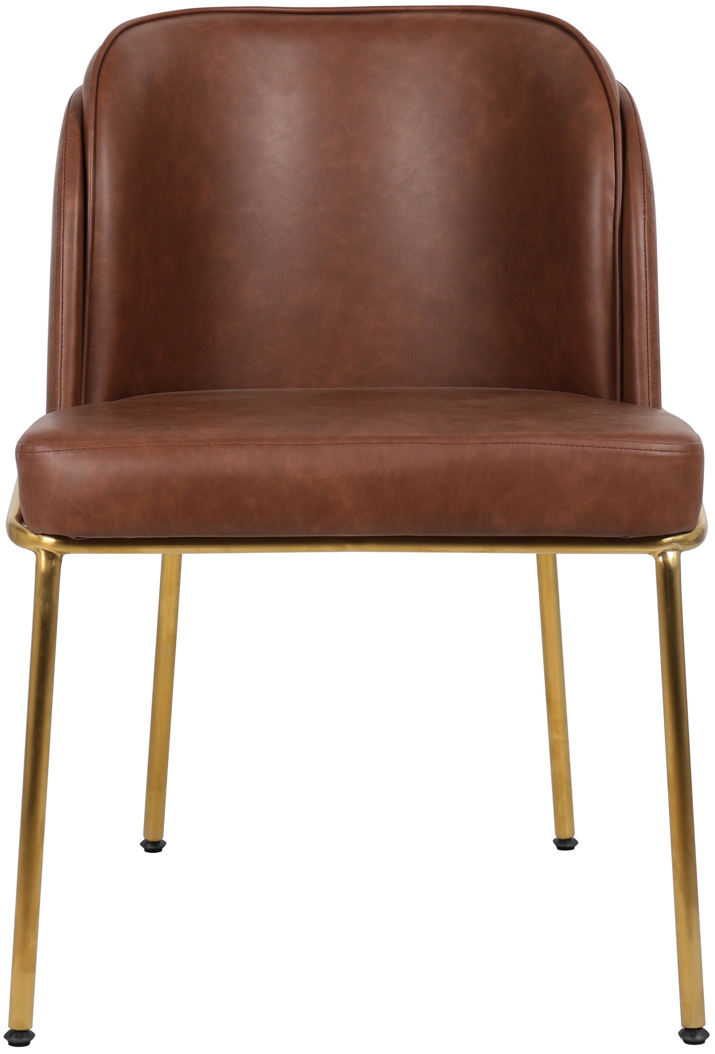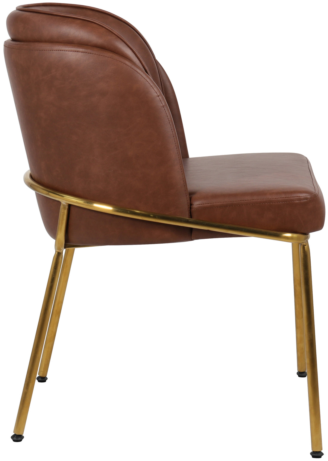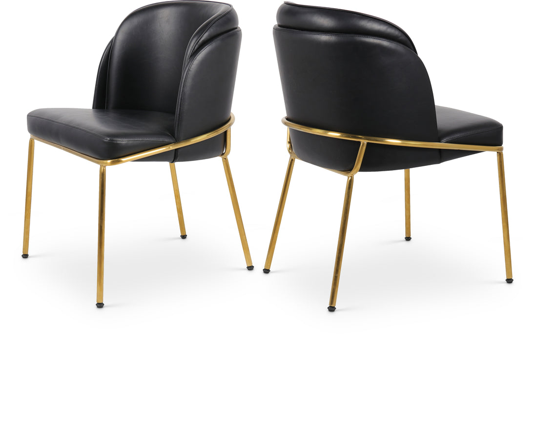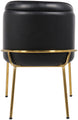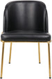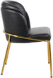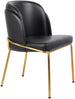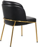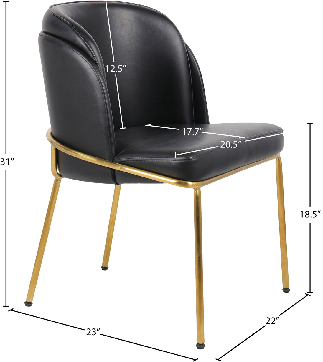 Give your dining room an upscale look with this Jagger vegan leather dining chair. The seat and back of this lovely chair comes upholstered in black vegan leather material that looks so genuine, only you will know it's not the real thing. Brushed gold iron legs on this chair lend it an upscale look and adds to its overall contemporary panache.