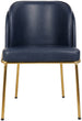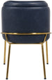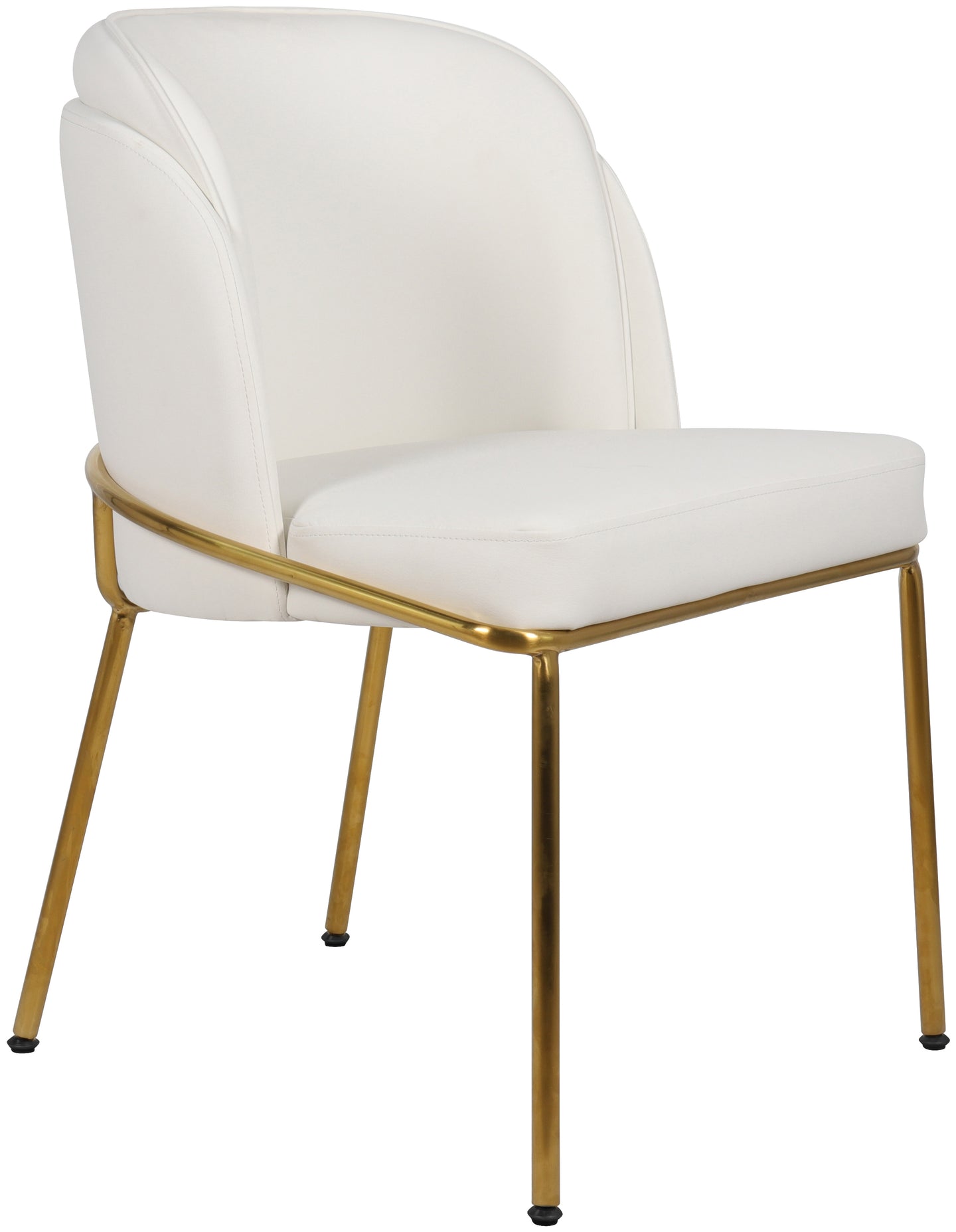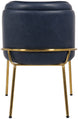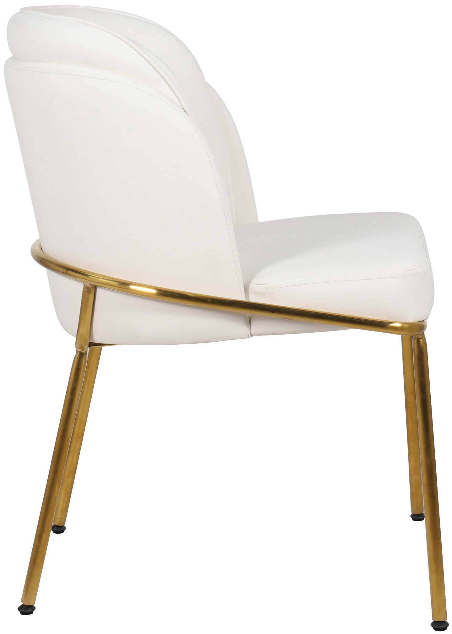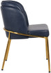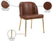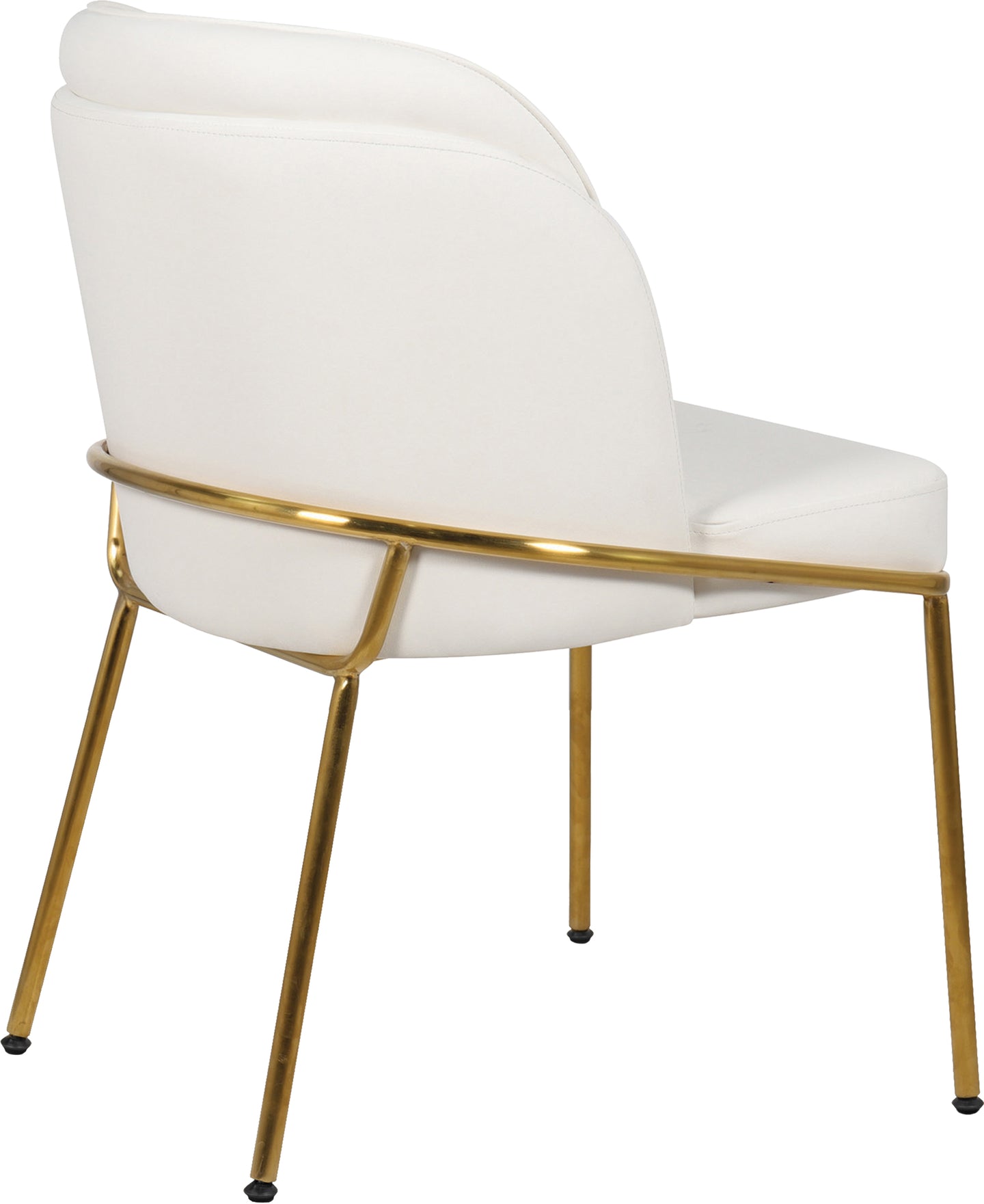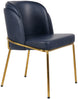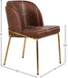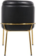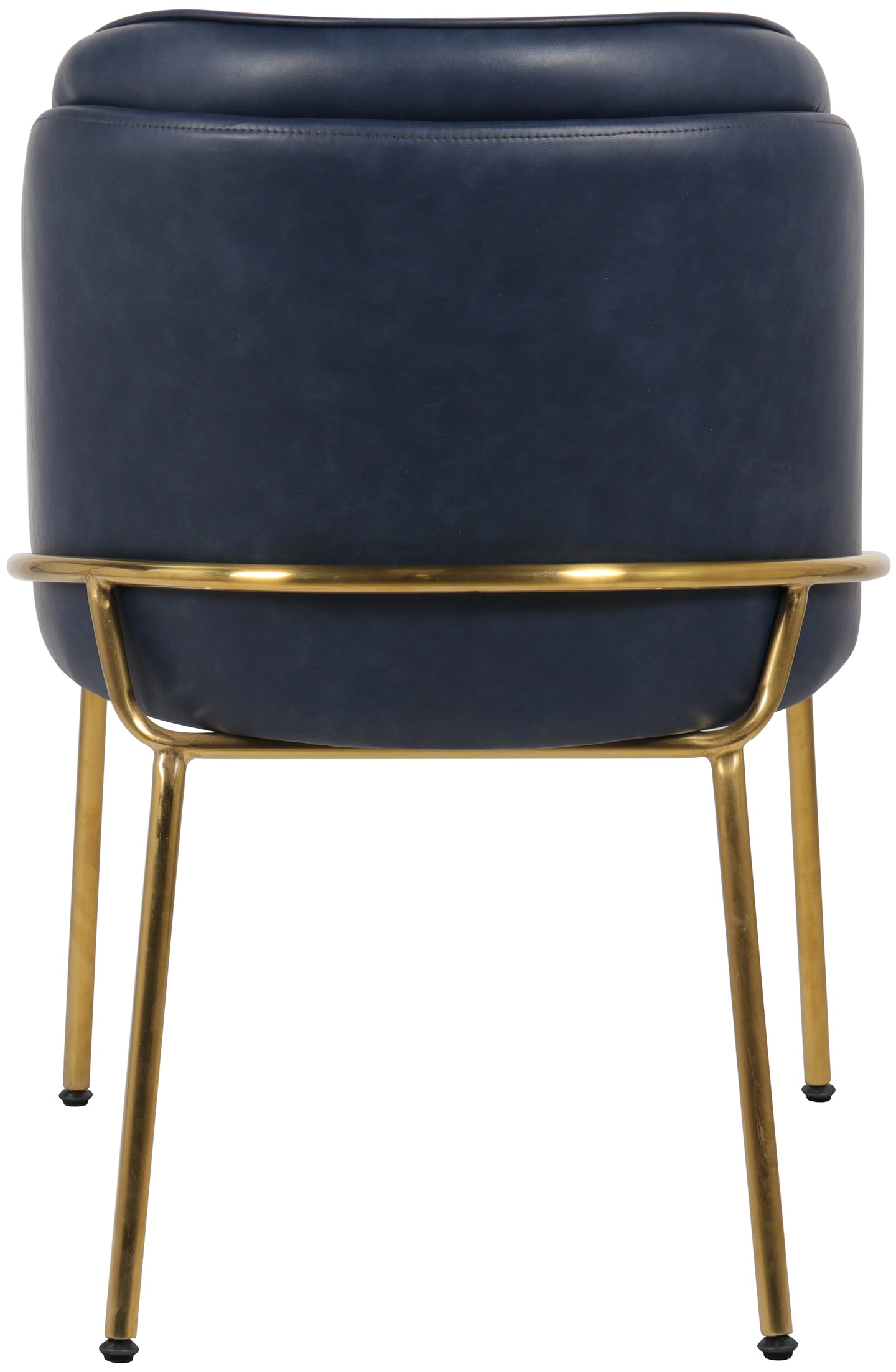 Give your dining room an upscale look with this Jagger vegan leather dining chair. The seat and back of this lovely chair comes upholstered in black vegan leather material that looks so genuine, only you will know it's not the real thing. Brushed gold iron legs on this chair lend it an upscale look and adds to its overall contemporary panache.