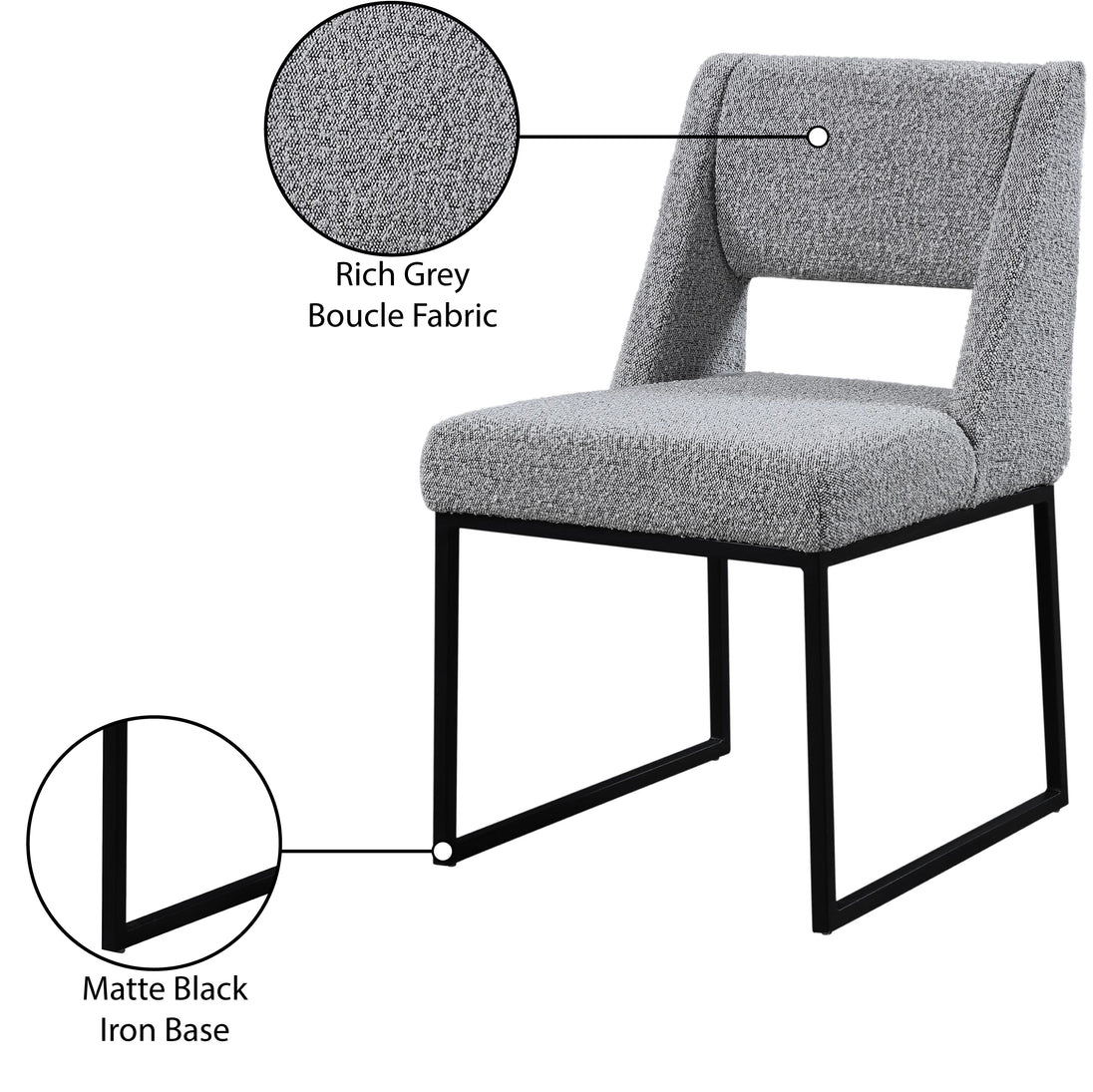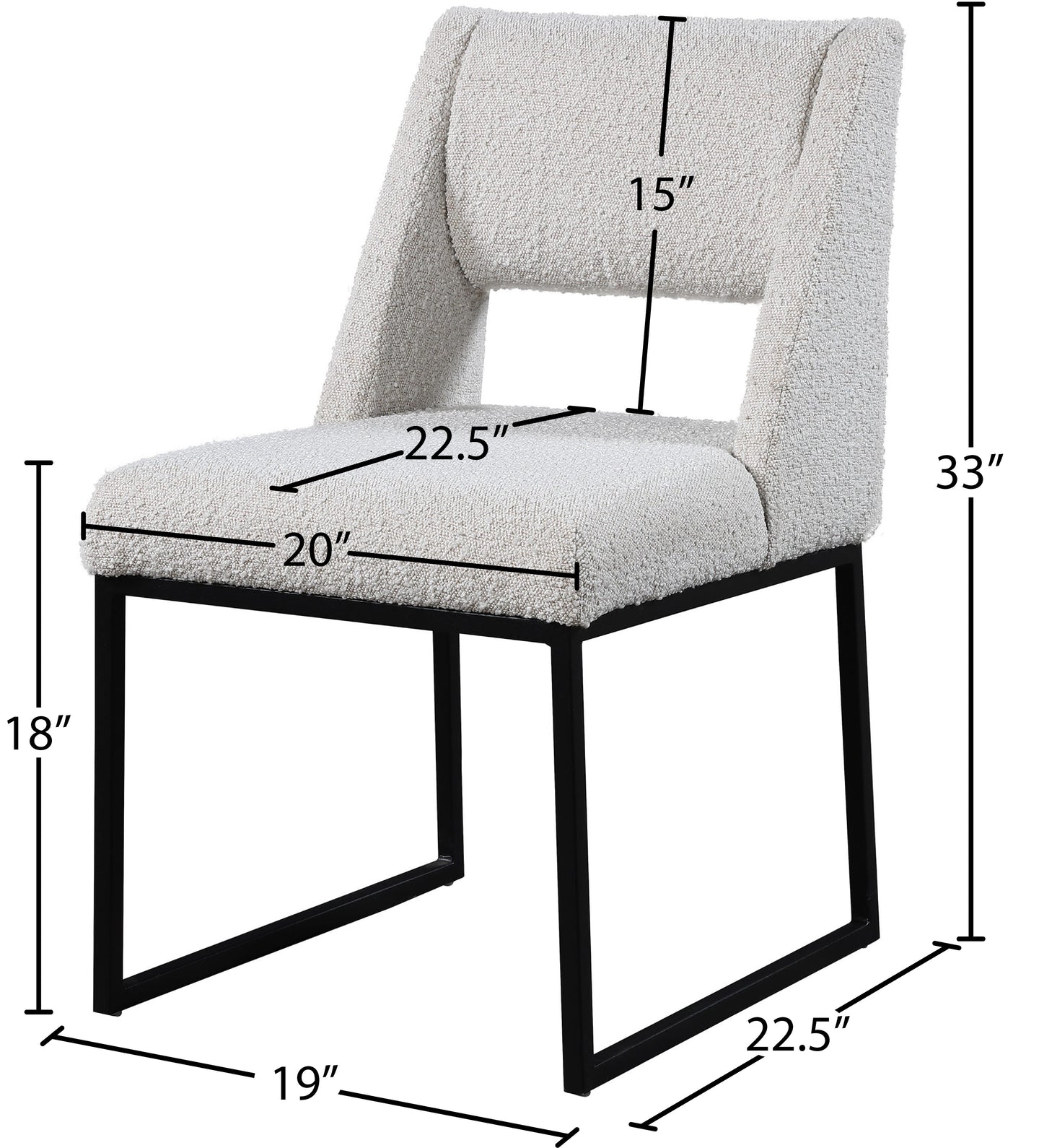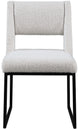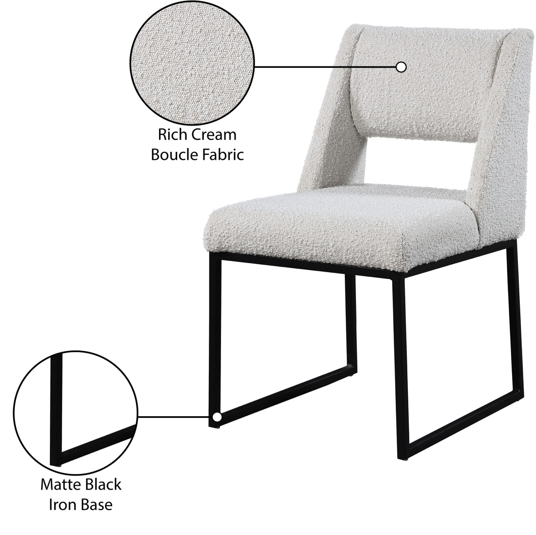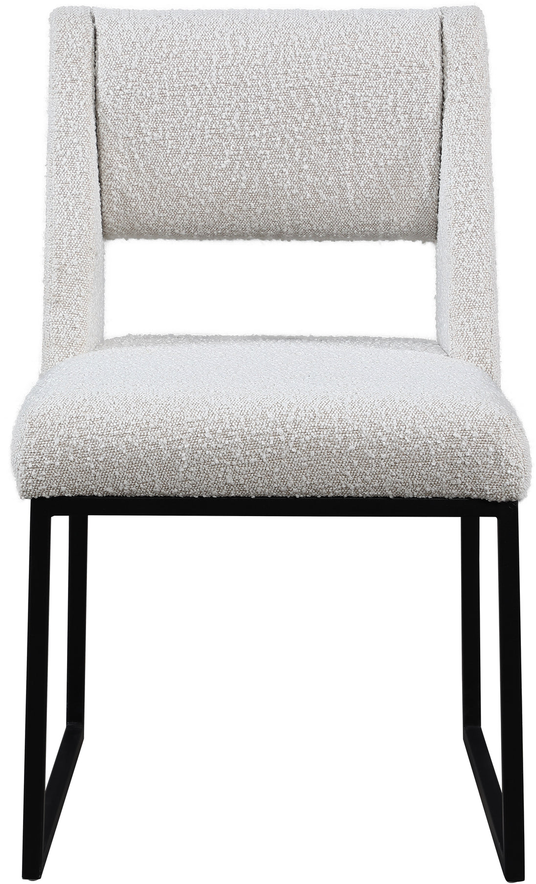 Give your dining area a contemporary makeover with this Jayce cream boucle fabric dining chair. Featuring a matte black iron base and rich cream boucle fabric, this dining chair is both sturdy and cozy. Its contemporary design is ideal for any modern home, and its neutral cream color matches any color dining table. Its plush boucle upholstery provides you with a comfortable pace to sit, and its open rectangular back is stylish while adding spine support.