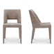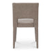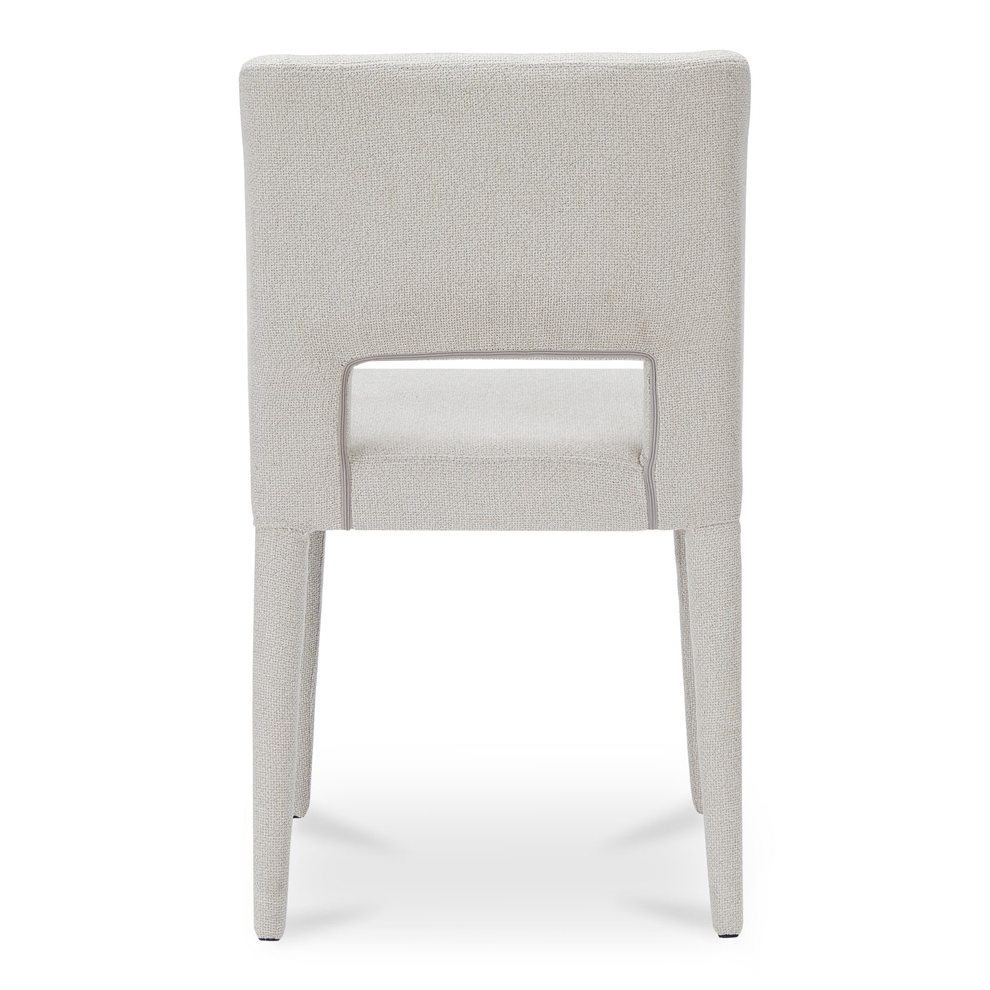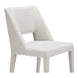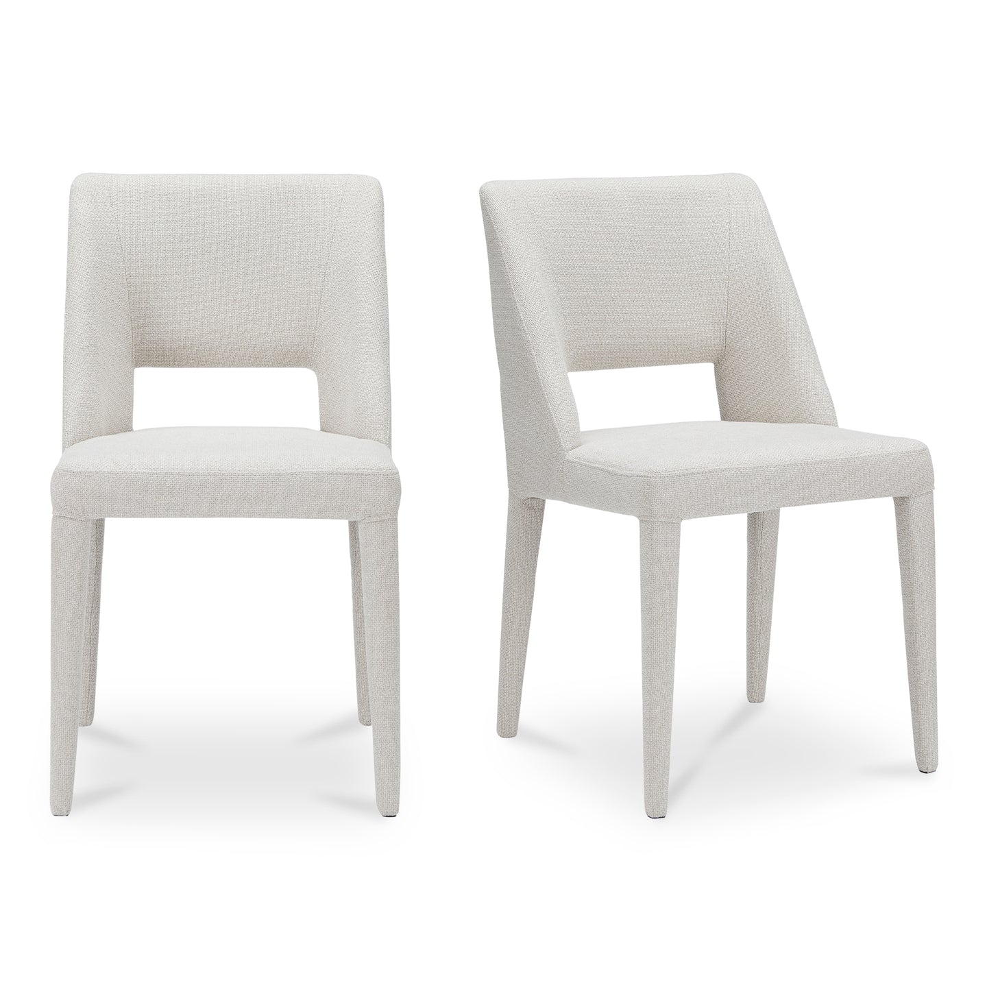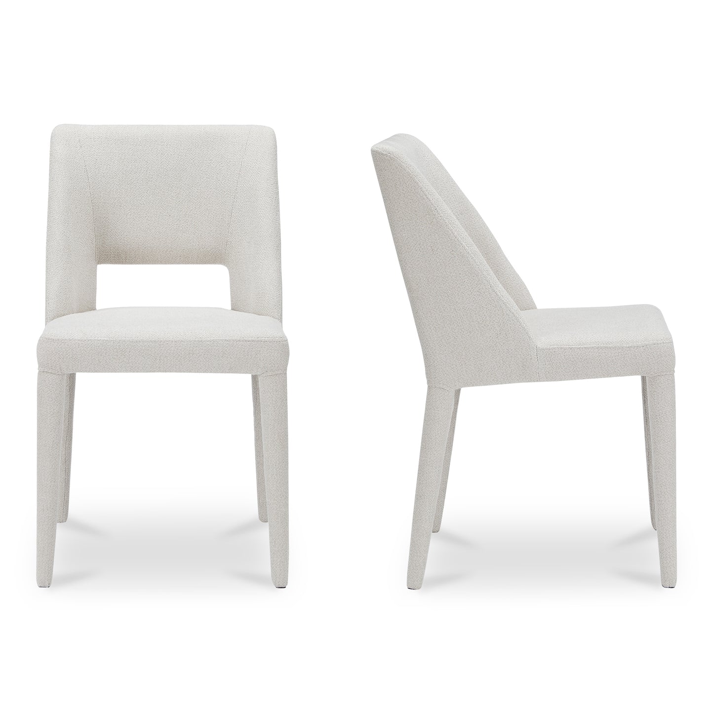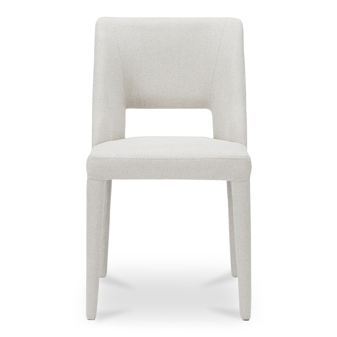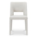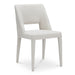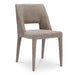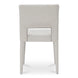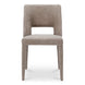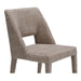 The Joyce dining chair's fully upholstered silhouette flows seamlessly from seat to base, enveloping a sturdy iron frame with easy-to-clean performance fabric. A meticulously carved lower backrest adds visual lightness, while extended sides offer discreet arm support.