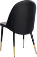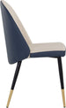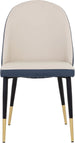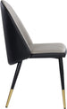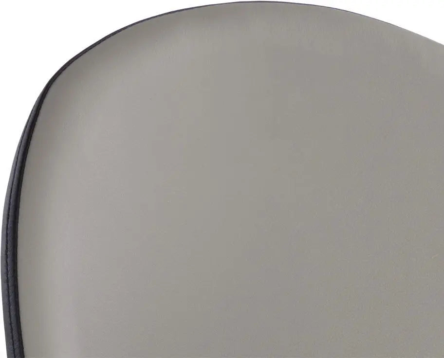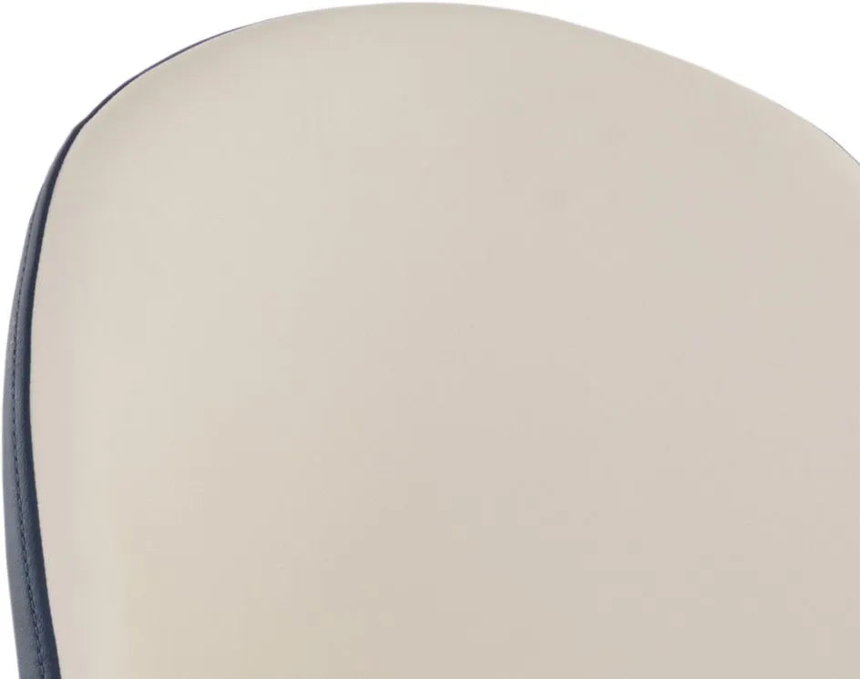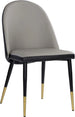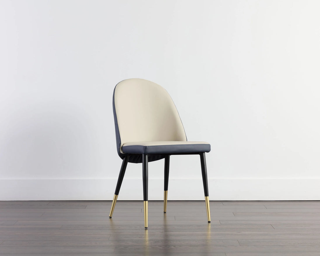 Smooth curves define this modern dining chair made distinct by its rounded seatback. The front is upholstered with dillon cream faux leather and dillon thunder faux leather in the back. Completed with black powder coated steel legs with gold caps. Also available in dillon stratus and dillon black faux leather combination. Handle With Care: This design has been crafted with faux leather. Faux leather is manufactured to reflect the natural characteristics of leather; as such, colour variations, markings wrinkles, grooves, and light scratches are appreciated characteristics. No two pieces will be alike. Visit our Product Care page for more information on how to ensure the lasting beauty of this piece.