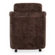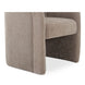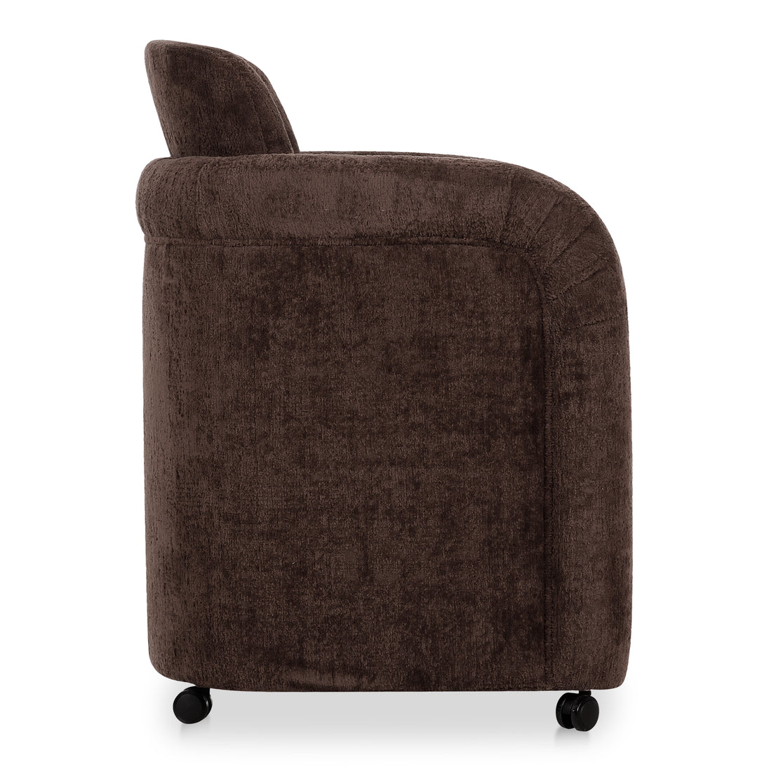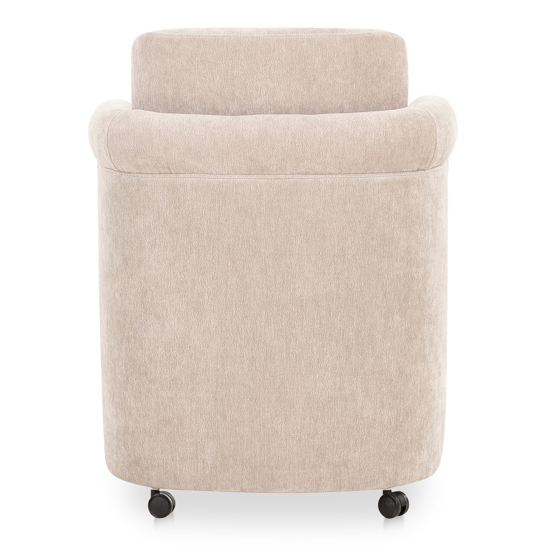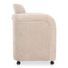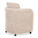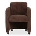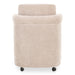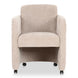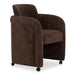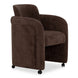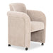 The Mesto dining chair encapsulates the essence of comfort-driven coziness. It features a well-padded seat that seems to float between an elegantly arched, curved, upholstered frame and a rolling base that can be replaced with included plastic legs to create stationary seating. The arms pay homage to traditional English roll styles with pleated details, blending classic craftsmanship with modern aesthetics, while the soft, textured upholstery adds a gentle, inviting touch to any space.