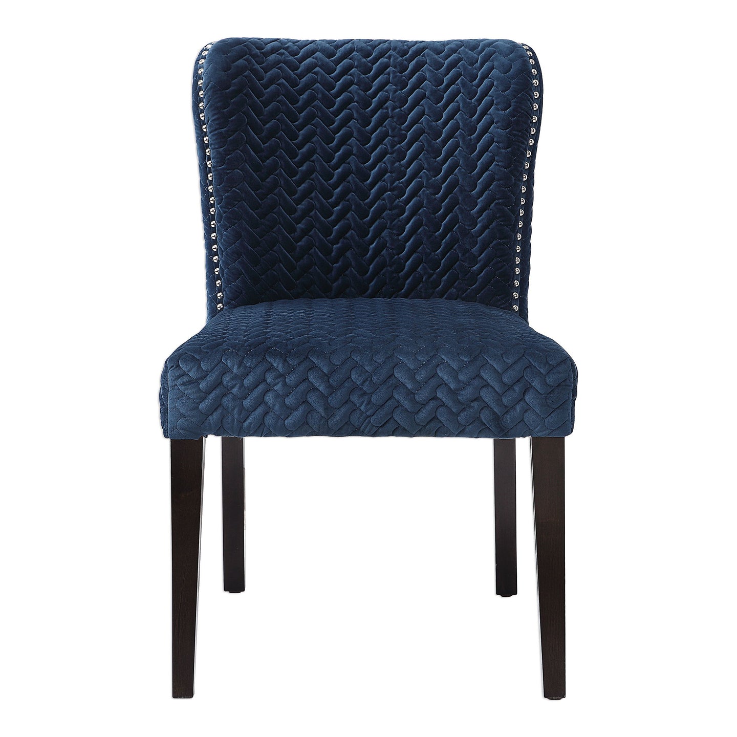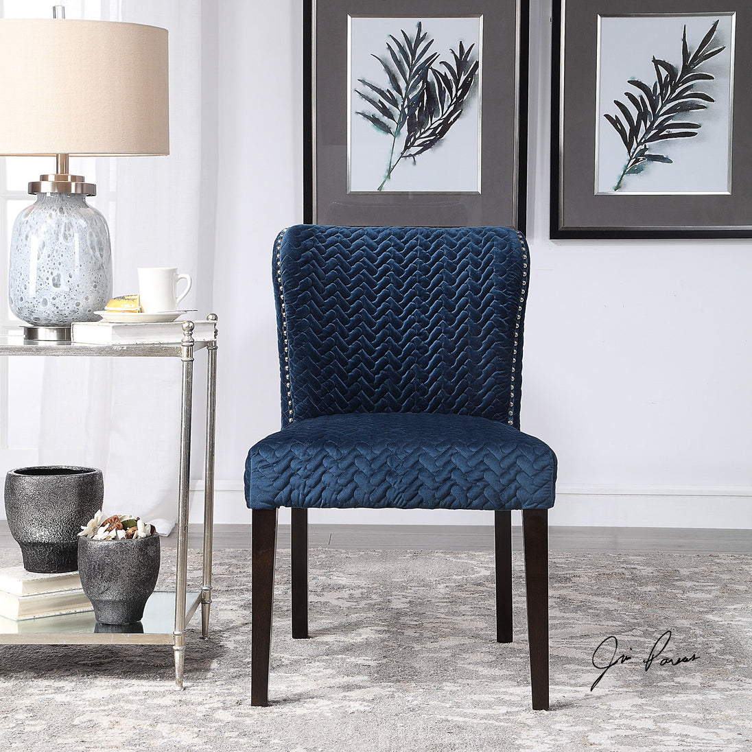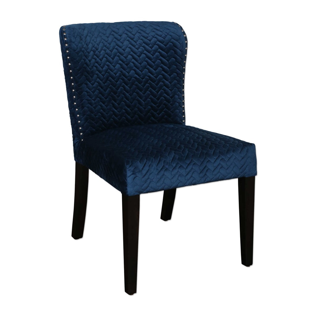 A Statement Accent Upholstered In A Rich Ink Blue Polyester Velvet Featuring A Herringbone Embroidered Texture, Complete With Polished Nickel Nail Head Trim. Birch Legs Stained In A Deep Walnut. Seat Height Is 21". Sold As A Set Of 2.Product Features