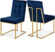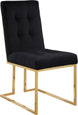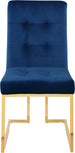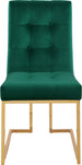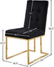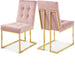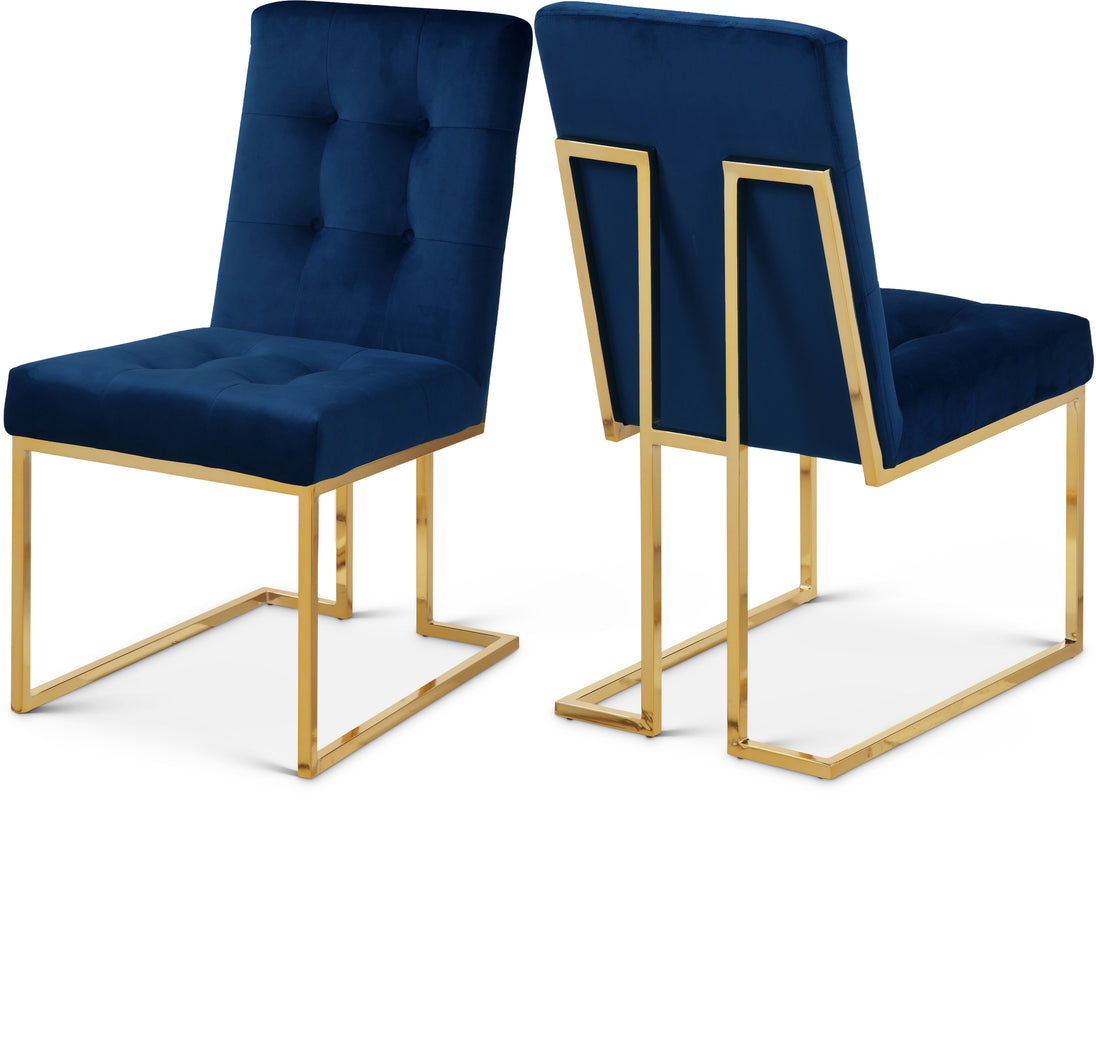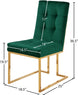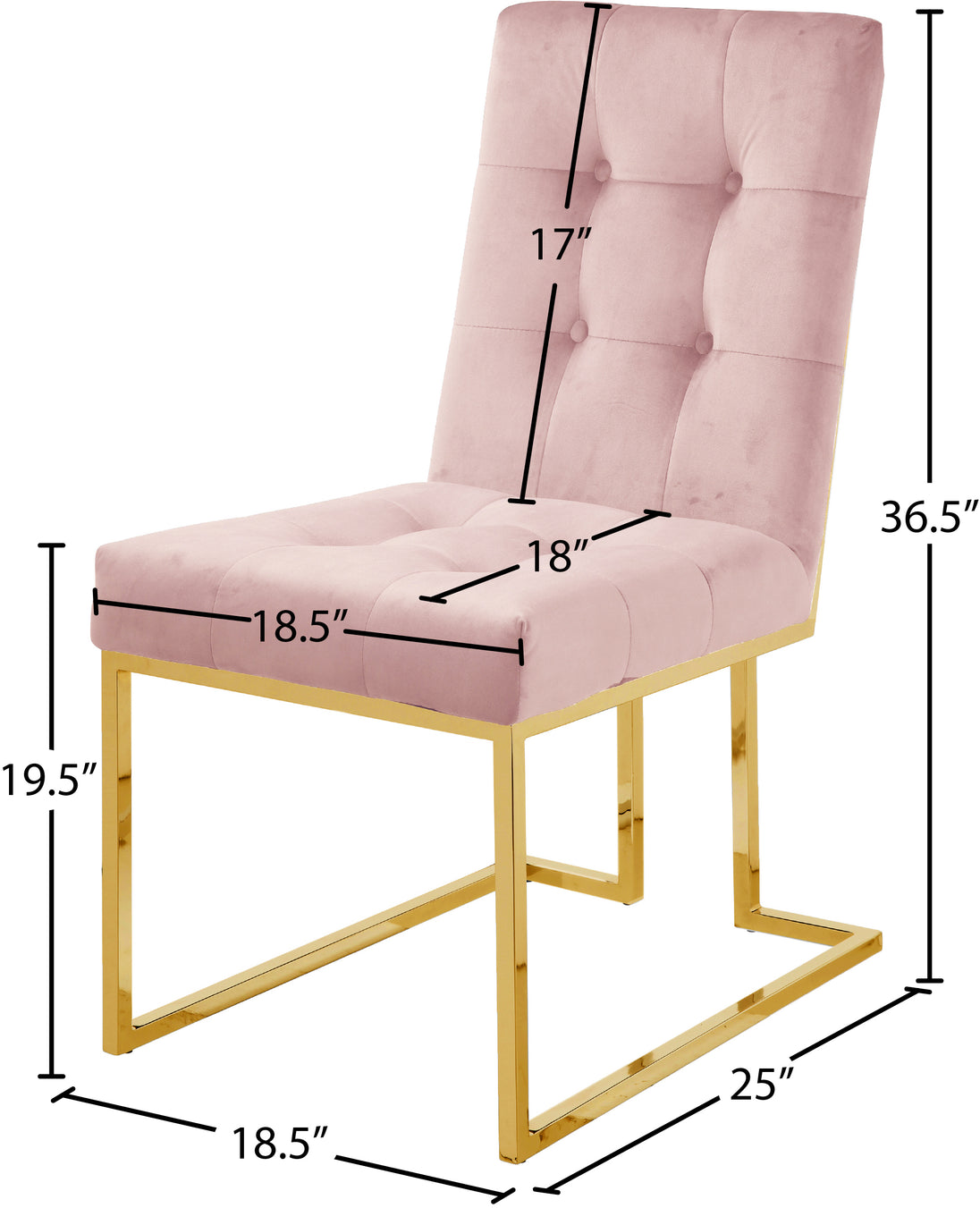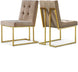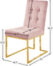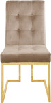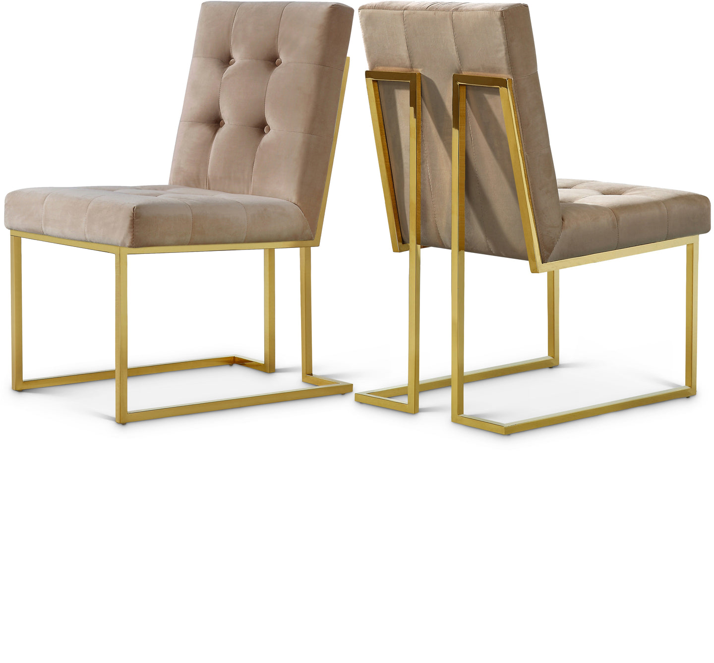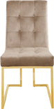 Elevate your dining experience with this Pierre beige velvet dining chair. A boxy geometric shape makes this chair an uber modern addition to your space, while a base of stainless steel makes it durable and tough, so it holds up to heavy daily use. The gold tone finish on the base contrasts nicely with the beige velvet upholstery used on the seat and back. Heavy tufting adds to the rich appeal of this beautiful design.